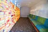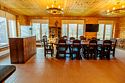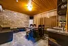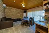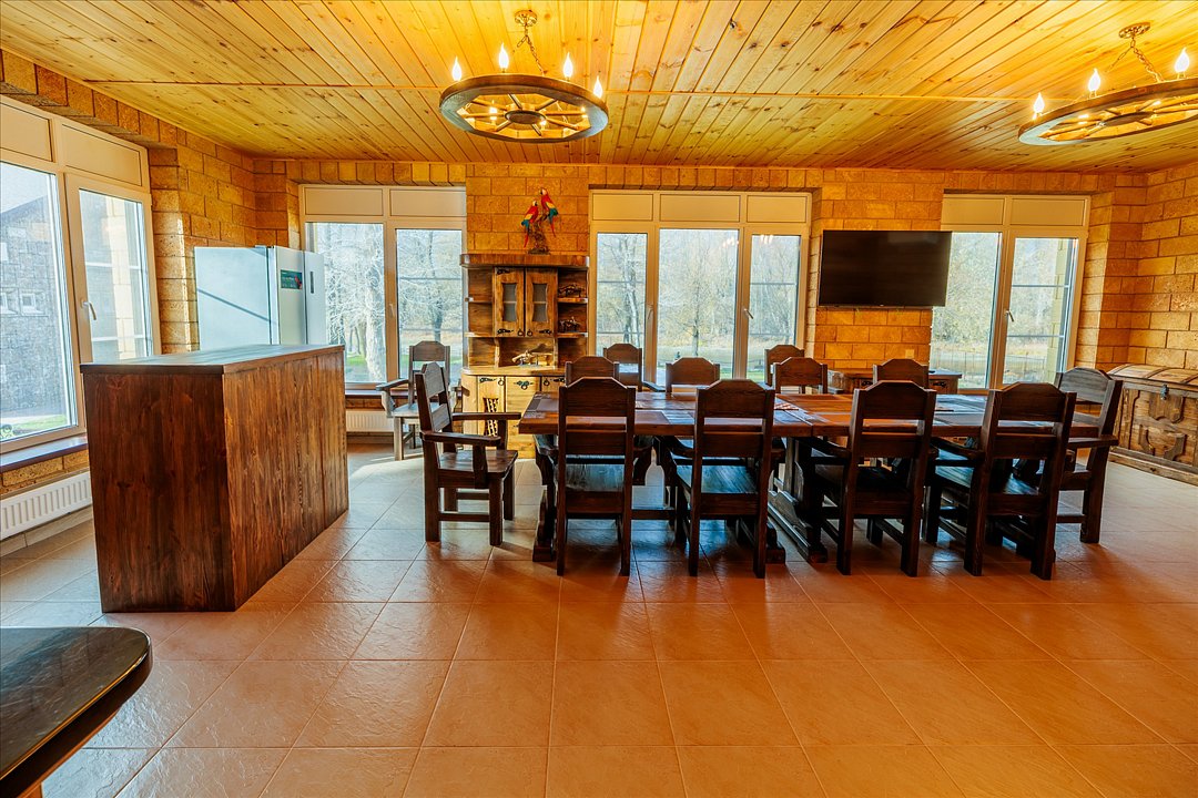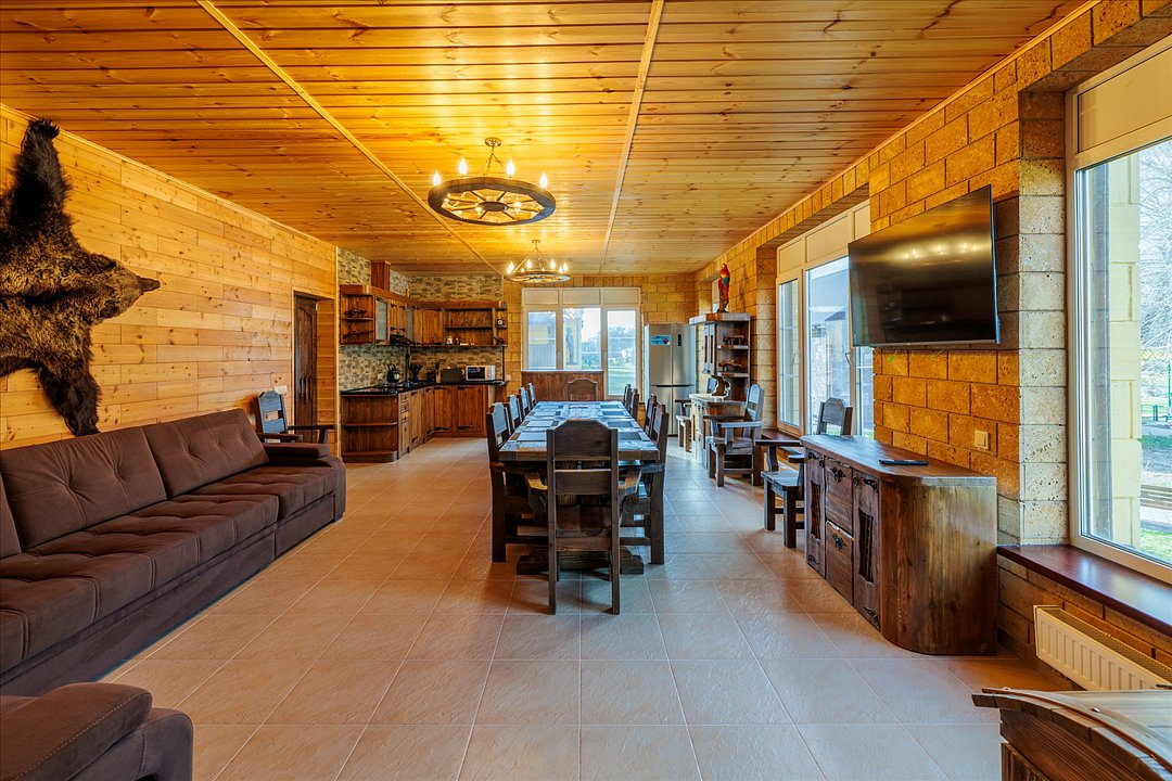 В зоне гостиной размещены большой стол, стулья на 12 человек, просторный диван, журнальный столик, барная тумба, телевизор.