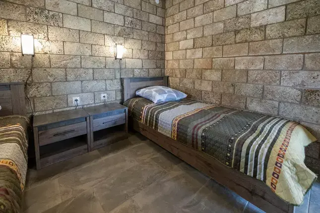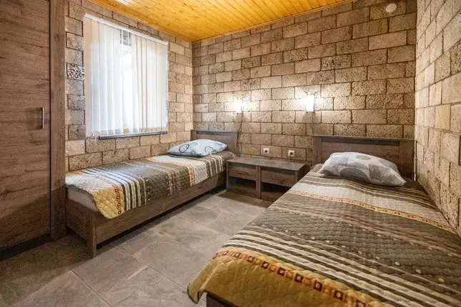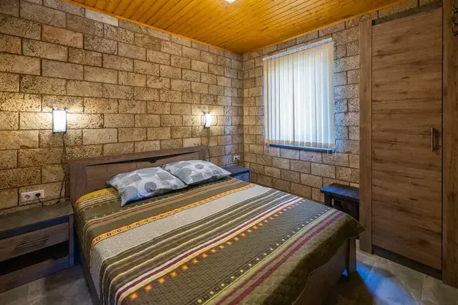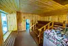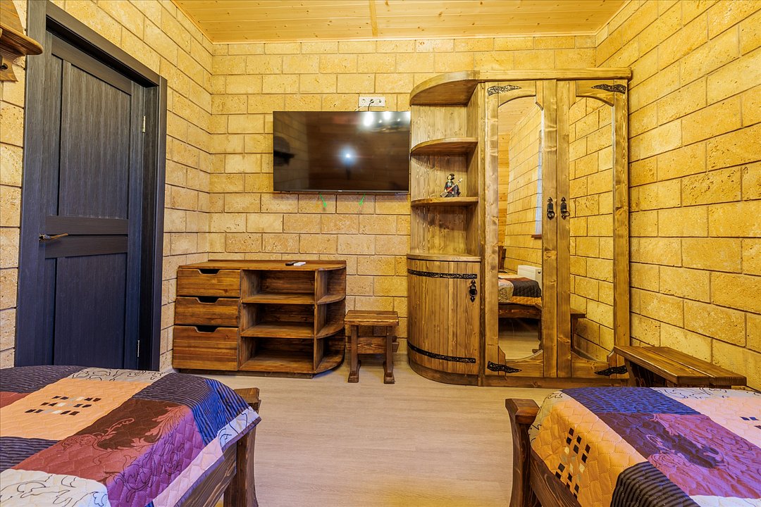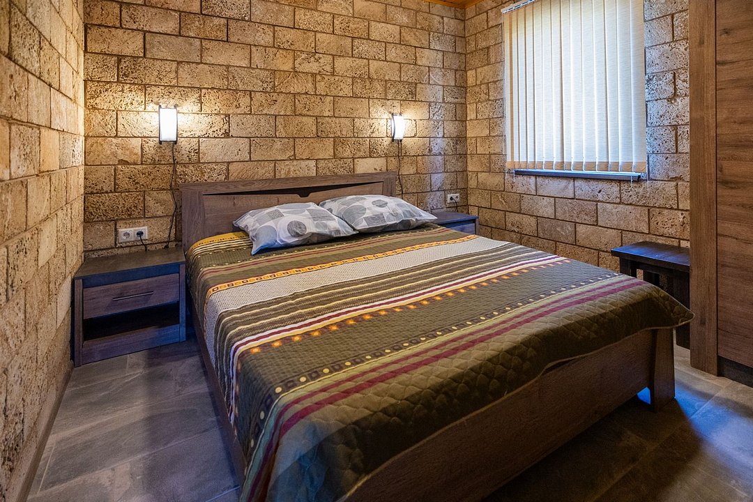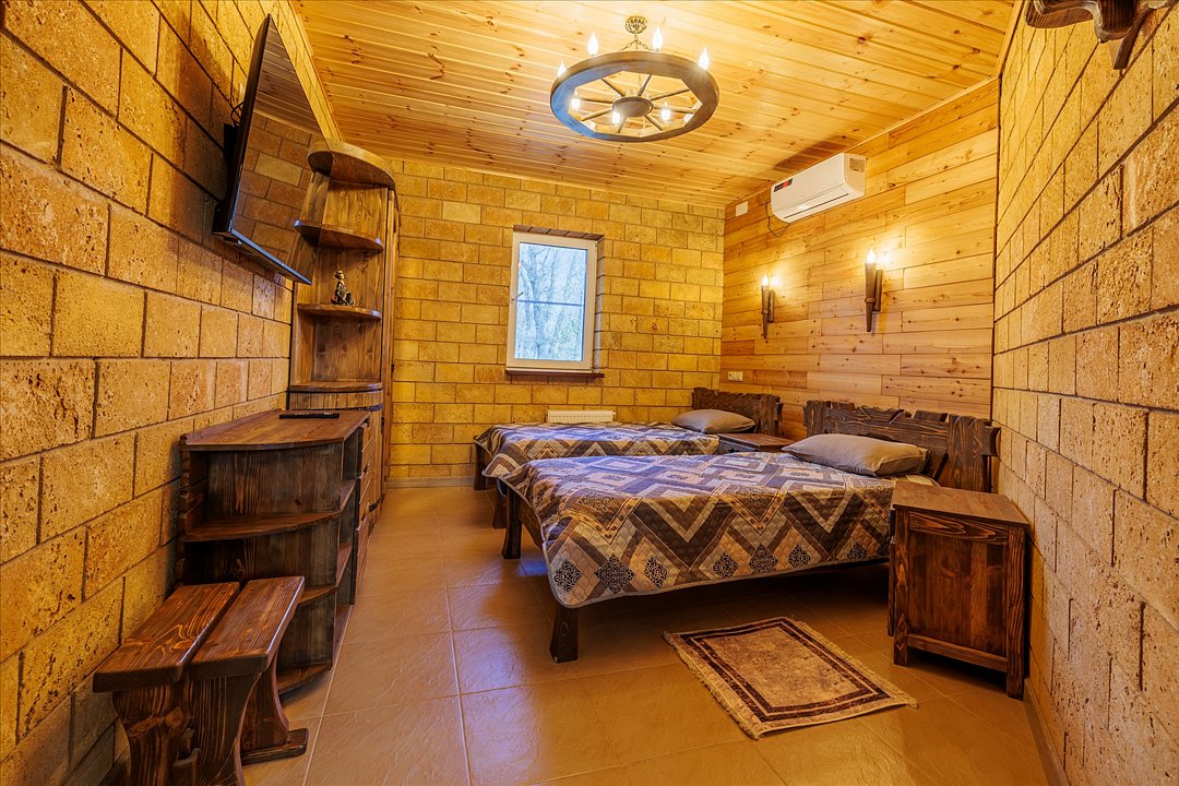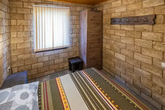 Домики укомплектованы либо двумя двуспальными кроватями, либо есть вариант домиков с одной двуспальной и двумя односпальными кроватями.