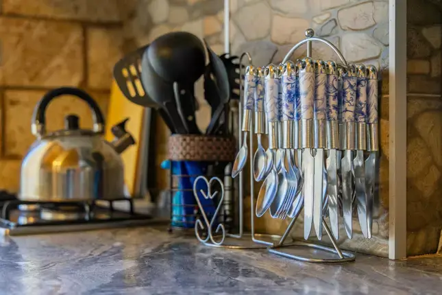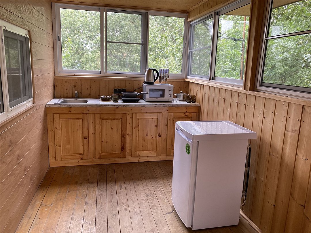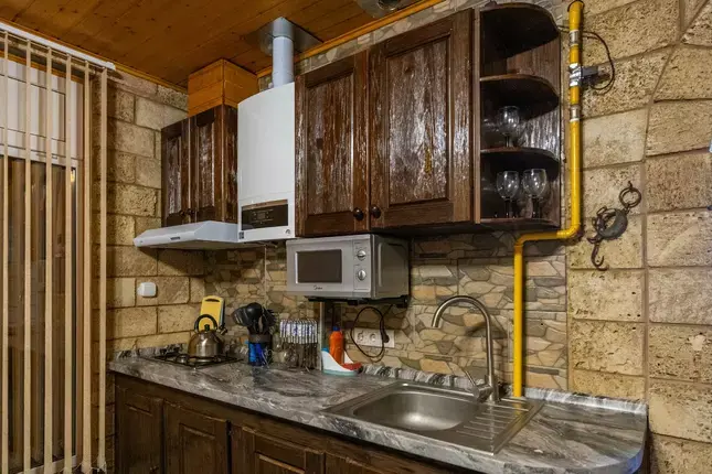 Кухонный гарнитур с набором посуды и комнаты отдыха расположены на 2м этаже домика.