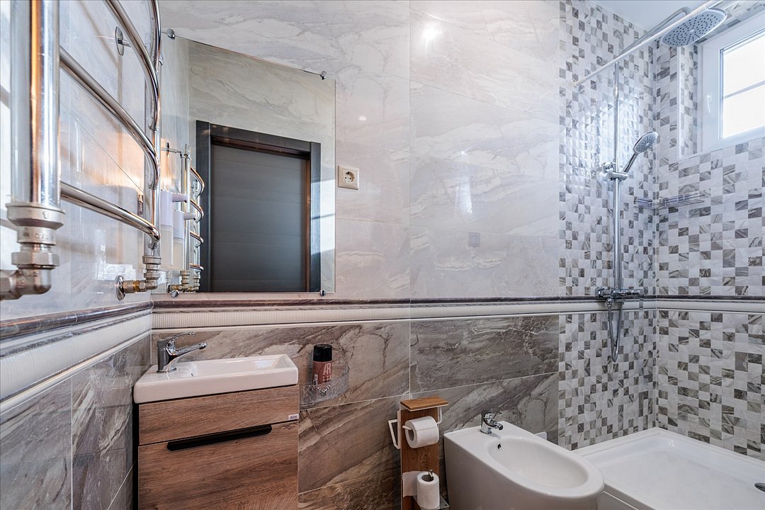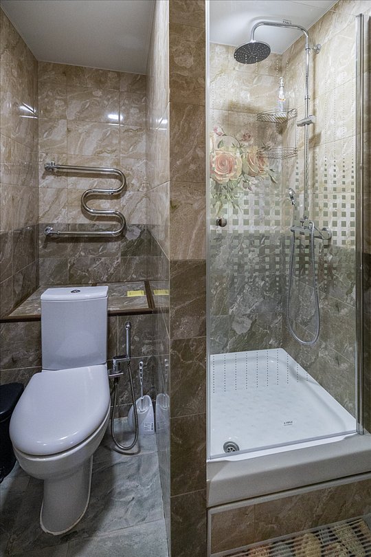 Санузел оснащен душевой кабиной, раковиной и унитазом.