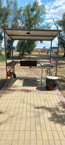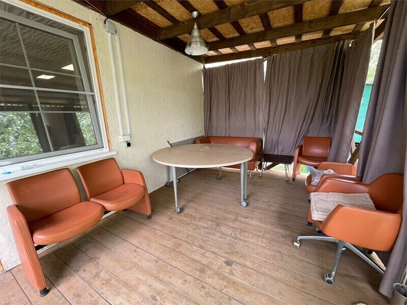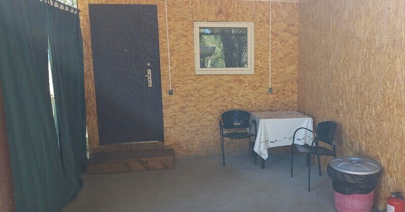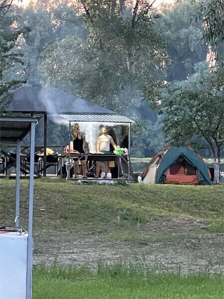 Имеется большой стол, стул-кресло холодильник, освещение, розетки, свой мангальный-остров с водоснабжением (вода питьевая) и освещением, рядом можно расположиться с палатками.