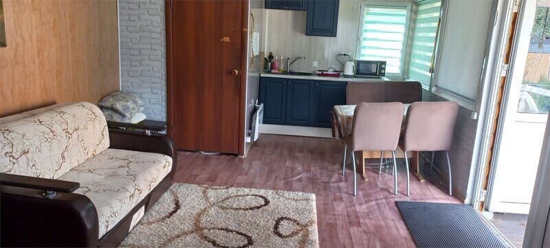Дом #2 состоит из трех комнат и небольшой террасы: 2 спальни и гостиная/кухня, душ/туалет(гор/хол. вода), отопление, терраса и навес и мангал рядом с домом. Рассчитан на 6 гостей, возможно размещение до 8 гостей с доп. местом на диване в гостиной.