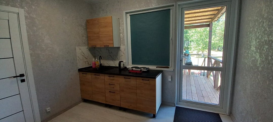 Дом-студия №3 состоит из одной комнаты и террасы, кухня, душ/туалет(гор./хол. вода), отопление, рассчитан на 2-4 гостя. Имеется свой мангальный остров с водой и раковиной.