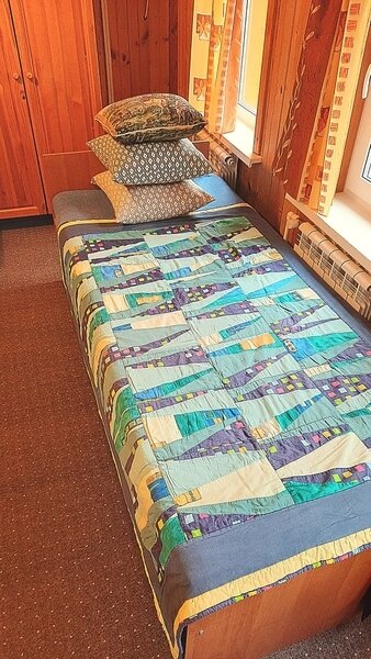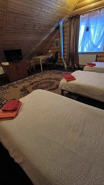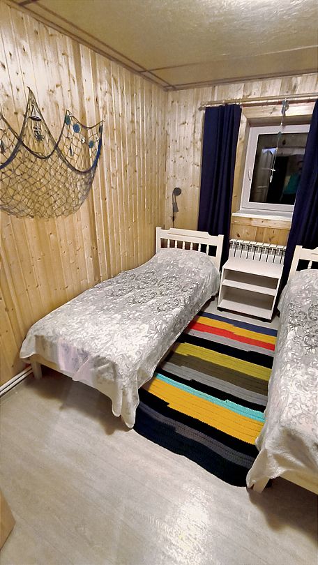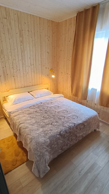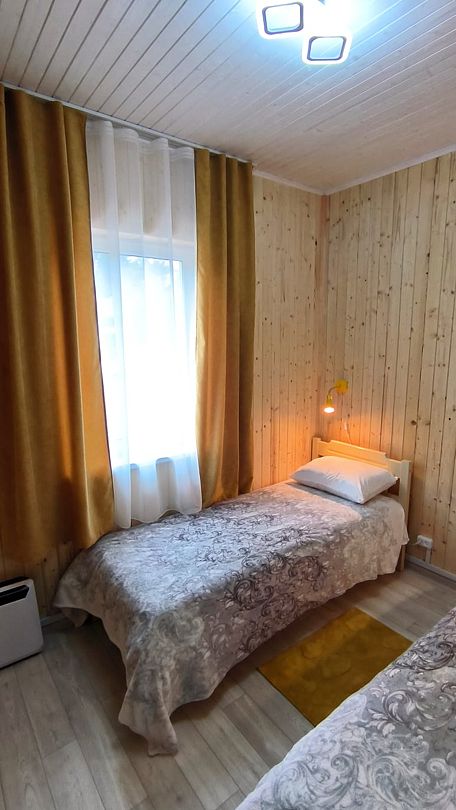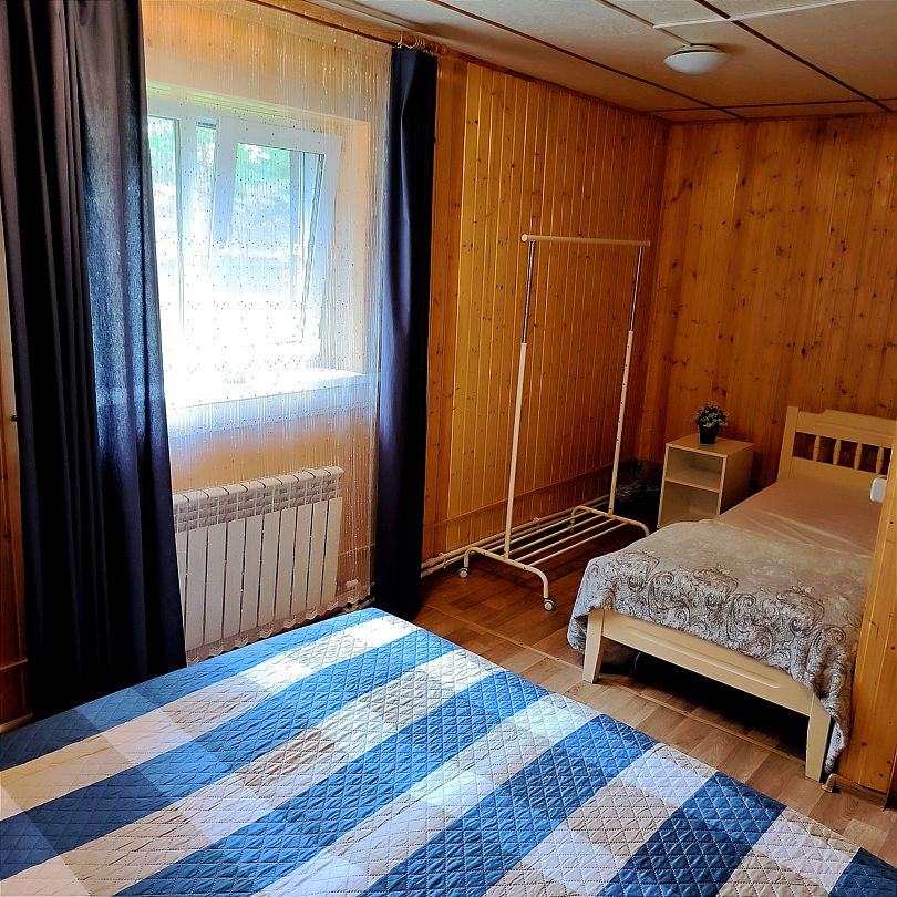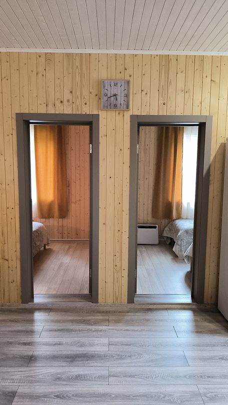 2 этажа, 2 комнаты. На 1 этаже: кухня, спальня с 2 спальной кроватью, санузел, котельная. На 2 этаже- 3 кровати.