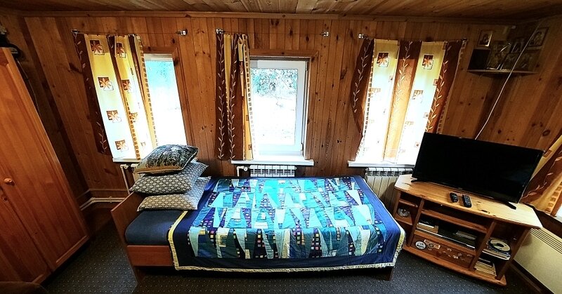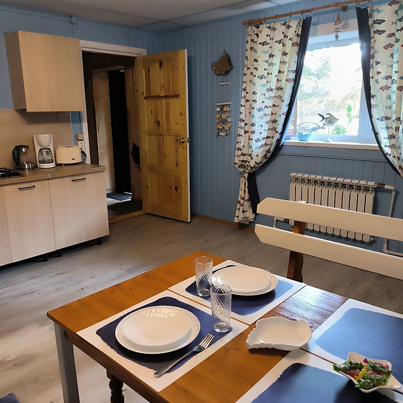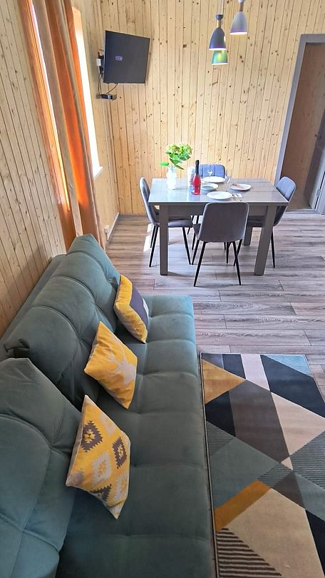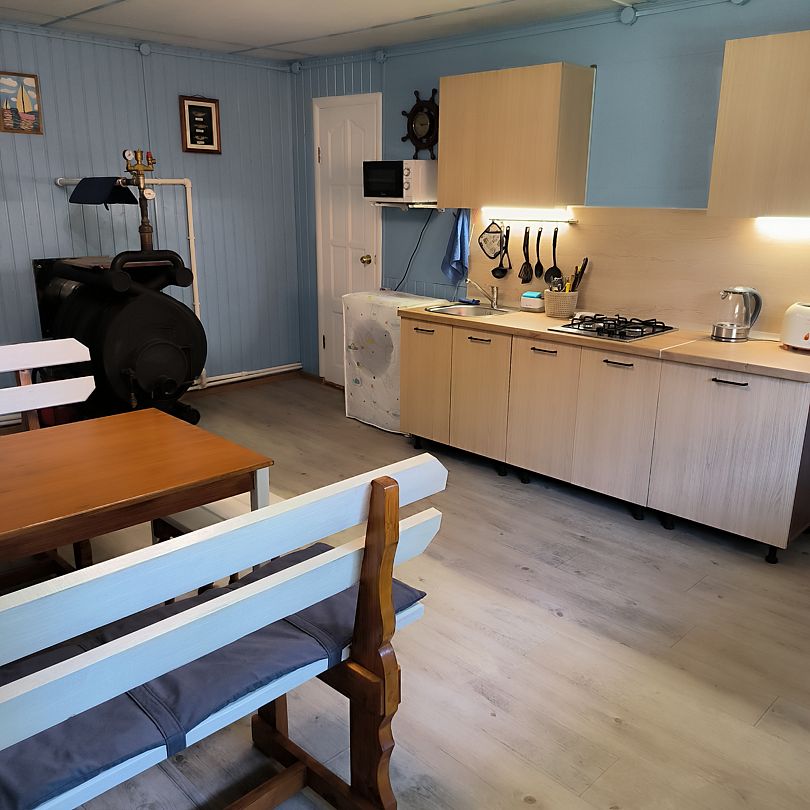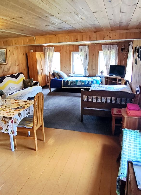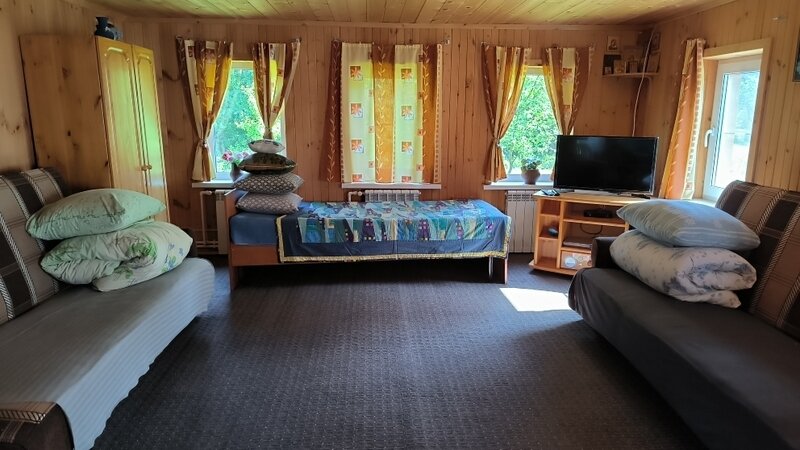 Дом имеет одну большую комнату-студию. Максимальное размещение – 3 чел на основных местах – два двуспальных дивана и кровать. Возможна установка доп.места – раскладушка.