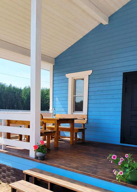 Широкая терраса, где можно кушать на воздухе, с которой видно шикарную клумбу, лес.