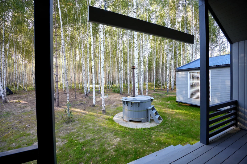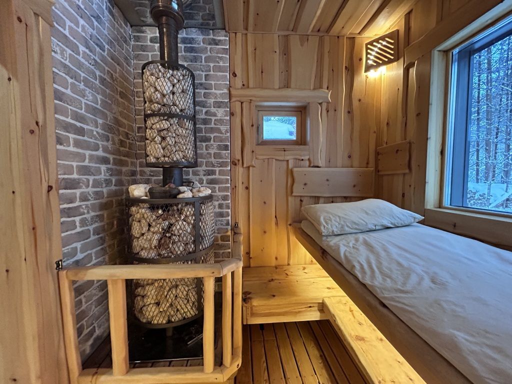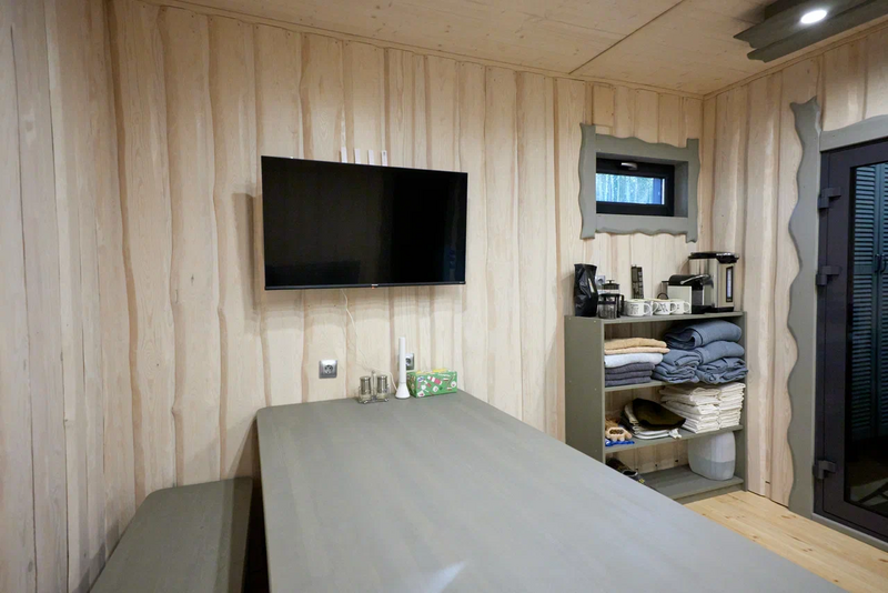 Инфраструктура: купель, зона отдыха, полотенца, душБаня с просторной верандой, гостиной санузлом и парилкой из кедра, душевой и вторым выходом в охлажденную купель, бронирование от трех человек.