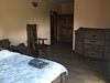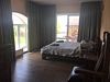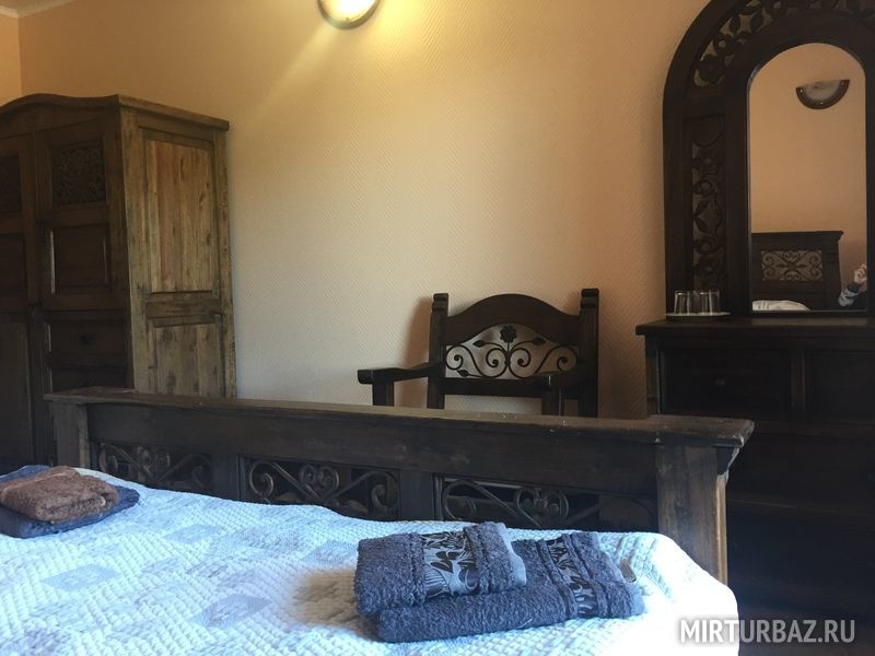 Комфортабельный номер с двуспальной кроватью, прикроватной тумбочкой, шкафом, комодом, зеркалом и балконом.