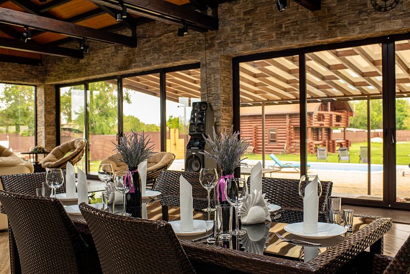 База отдыха приглашает вас насладиться атмосферой истинного комфорта и умиротворения в уютной зоне отдыха на закрытой террасе. Пространство с панорамными окнами, мягкими диванами и обеденным столом создает ощущение уюта и релакса. Здесь вы можете с удовольствием провести время за приятной беседой, наслаждаясь мерцанием камина и плавными ритмами музыки.
