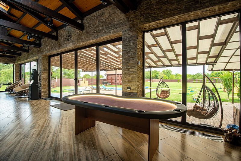 К вашим услугам также оборудованная кухонная зона для приготовления любимых блюд, телевизор для развлечения и даже стол для игры в покер — все, что необходимо для незабываемого отдыха в компании друзей или близких.