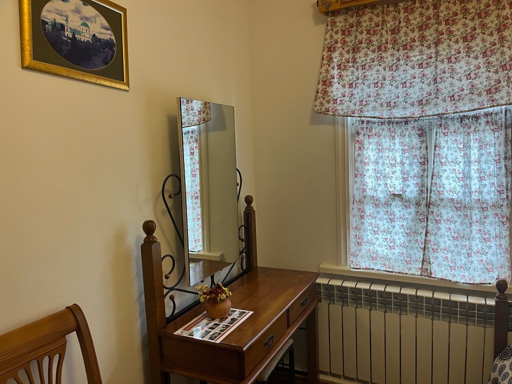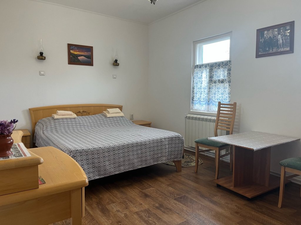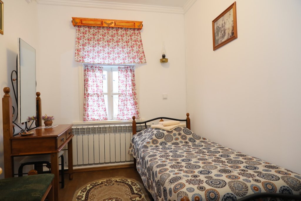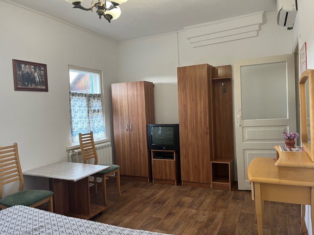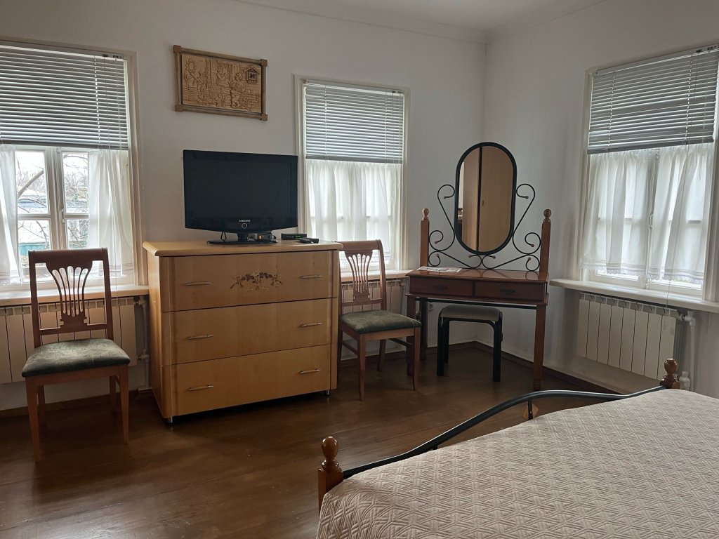 Интерьер номеров выдержан в казачьем стиле: белые стены, деревянная мебель, домотканые коврики на полу.