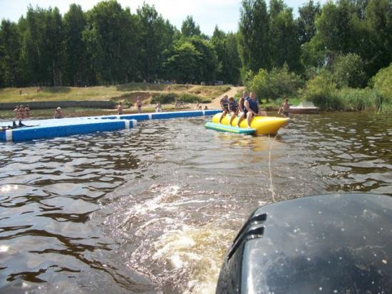 Прибрежное мелководье очищено и оборудовано надежными понтонами, которые особенно нравятся маленьким гостям. Те, кто постарше, непременно захотят кататься на «банане», «ватрушке», на водных лыжах или покрутиться в большом шаре, устанавливаемом прямо на воду. Удовольствия получается не меньше чем на море.