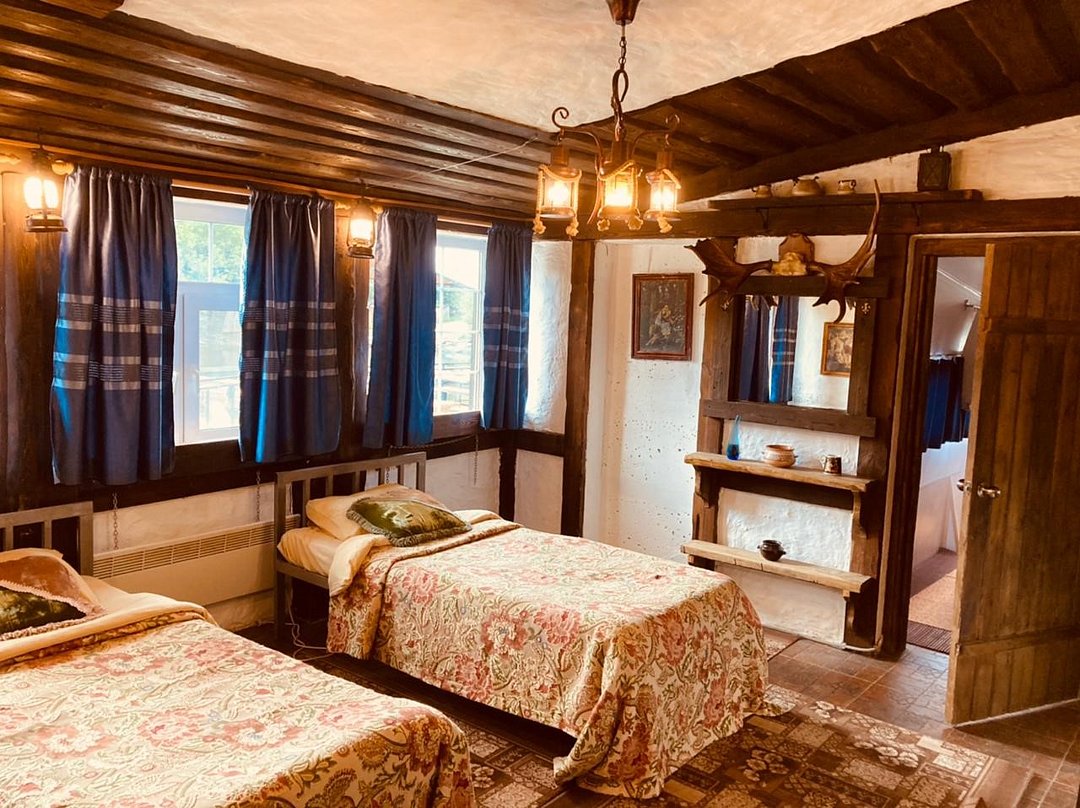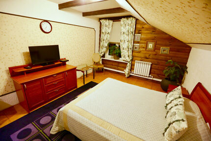 1кровать(двухместная),баня,камин, душ,шкаф,комод,телевизор,туалетные принадлежности,прикроватные