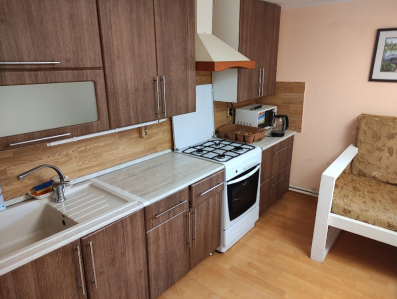 Кухня: холодильник, эл. плита, эл. чайник, микроволновая печь, посуда для самостоятельного приготовления и приема пищи. Питьевая вода отличного качества из крана.