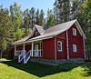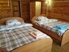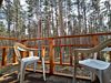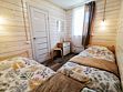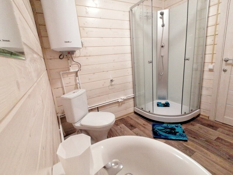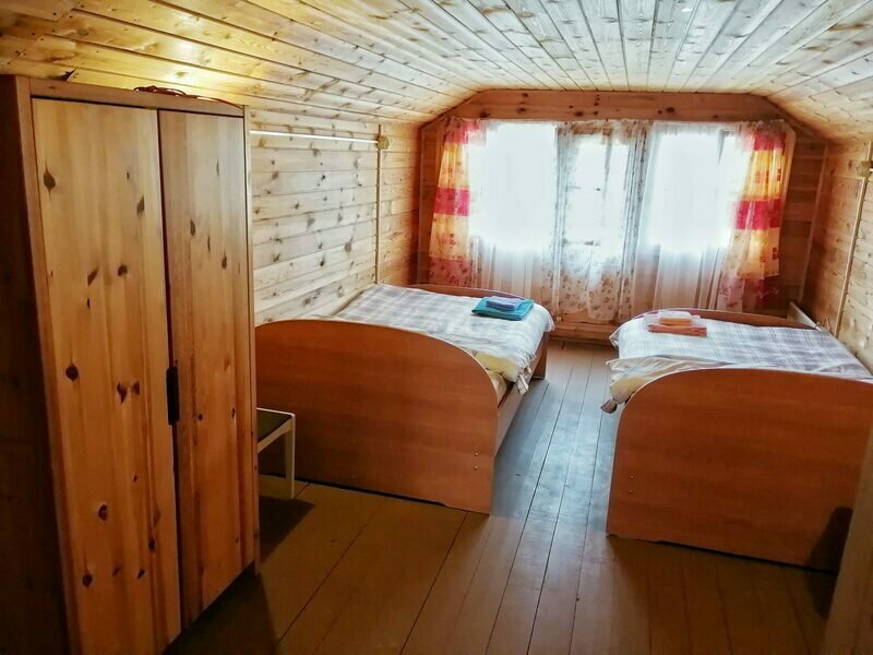 На первом этаже расположена веранда, кухня-столовая, санузел, душевая и баня. На втором этаже две спальни по три односпальные кровати в каждой и балкон с видом на сосновый бор.