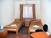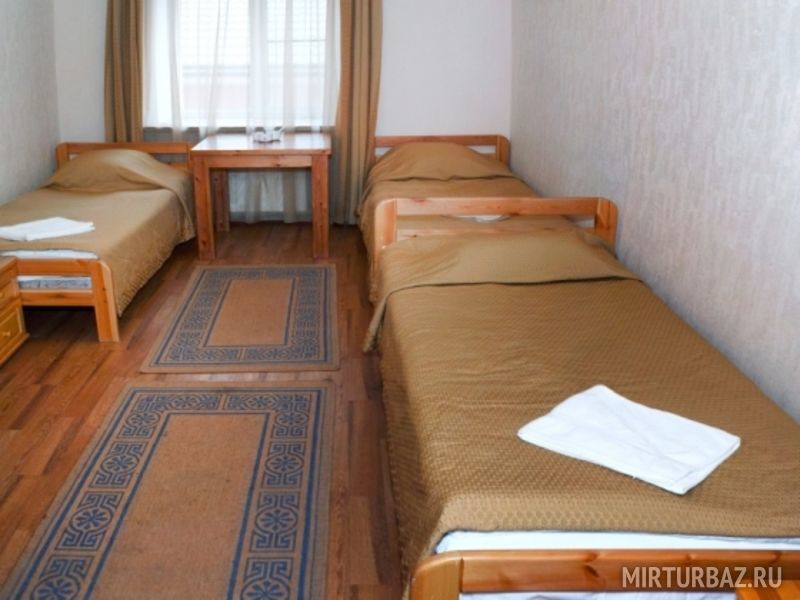 Трехместный номер эконом включает в себя: две кровати, две прикроватные тумбочки, шкаф, небольшой столик, стулья, чайник с чашками, телевизор.
