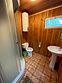 Санузел: душевая кабина, унитаз, раковина, зеркало с полочкой и окно.