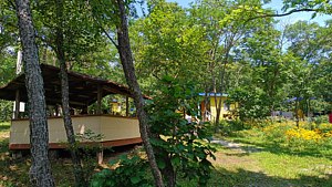 Здесь вы сможете разместиться в одном из уютных номеров или арендовать просторный коттедж для большой компании, прогуляться по красивому лесочку и полюбоваться видом на море, которое находится совсем рядом.