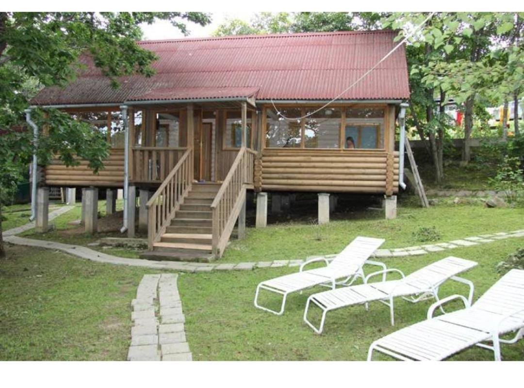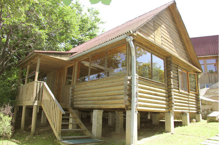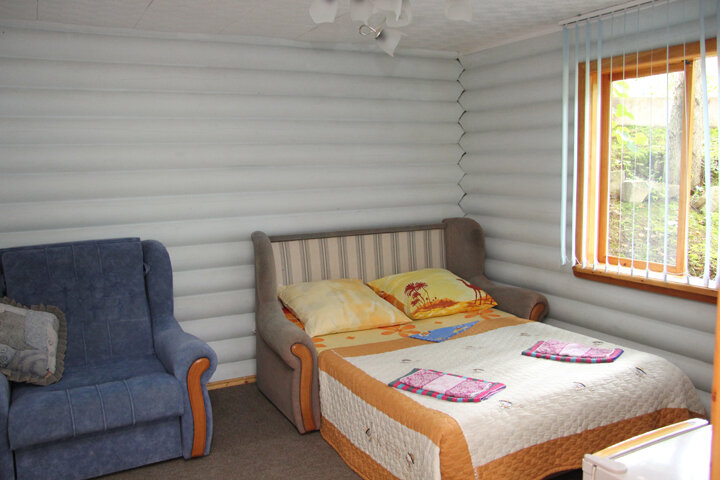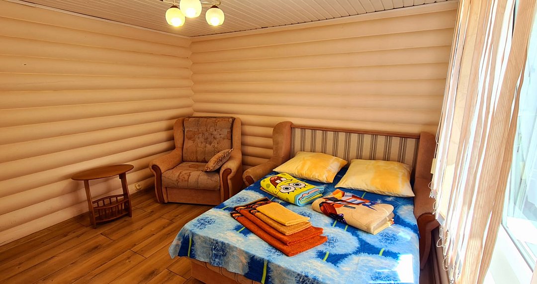 Домик из круглого бревна с двумя двухкомнатными номерами «люкс», рассчитанными на пребывание 2-3 человек в каждом.