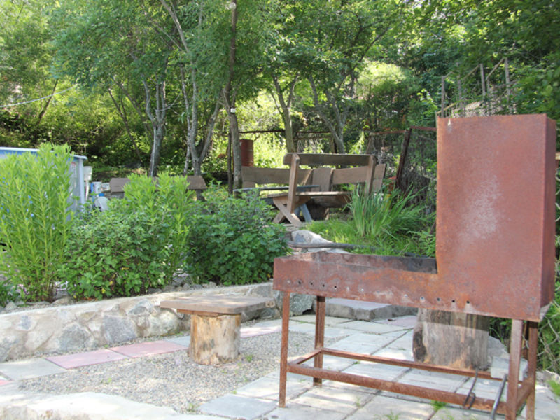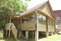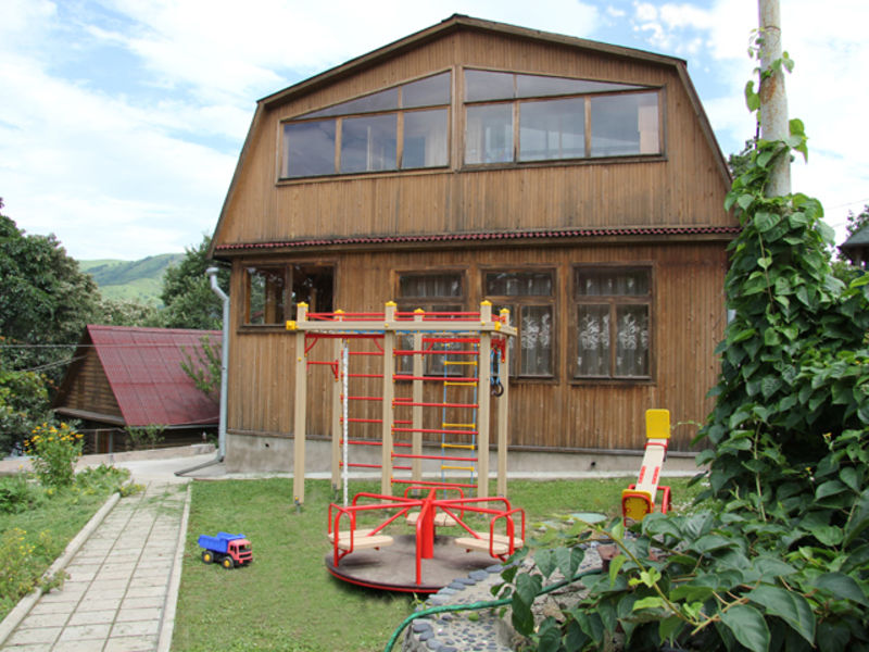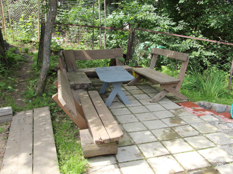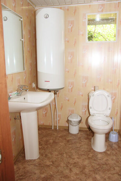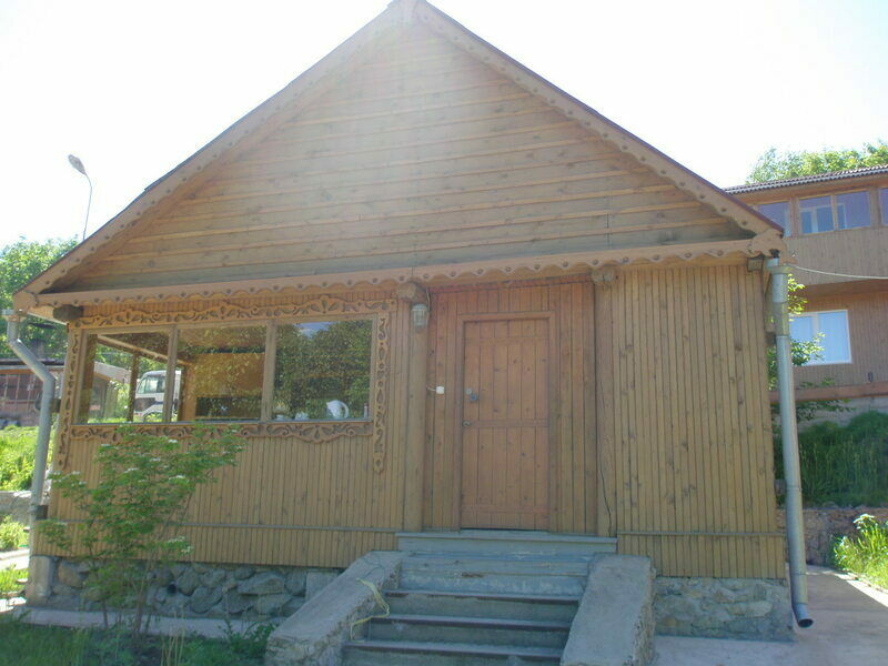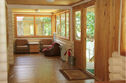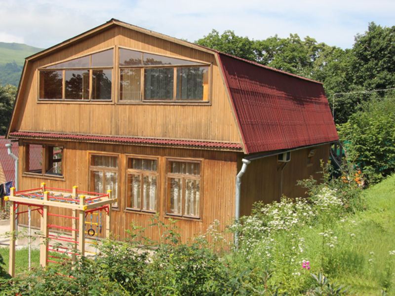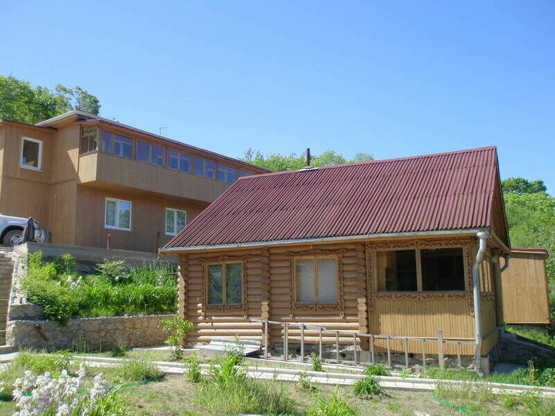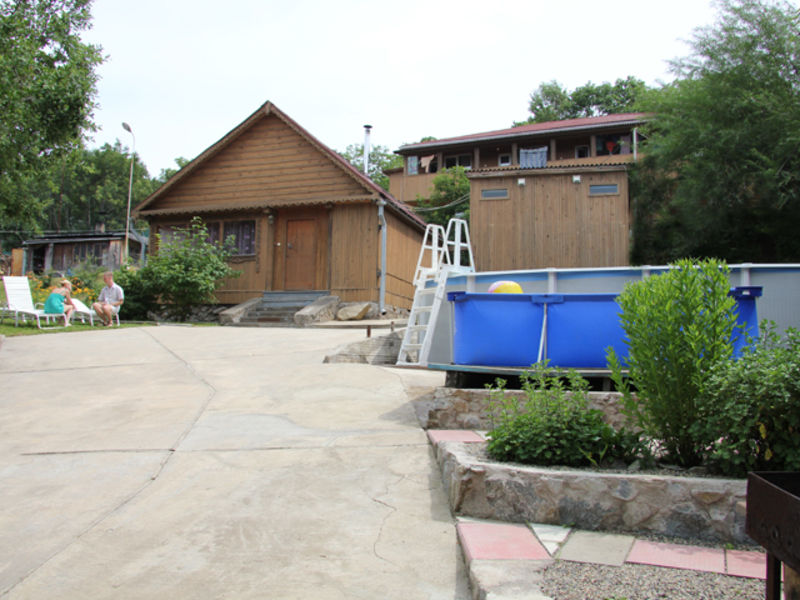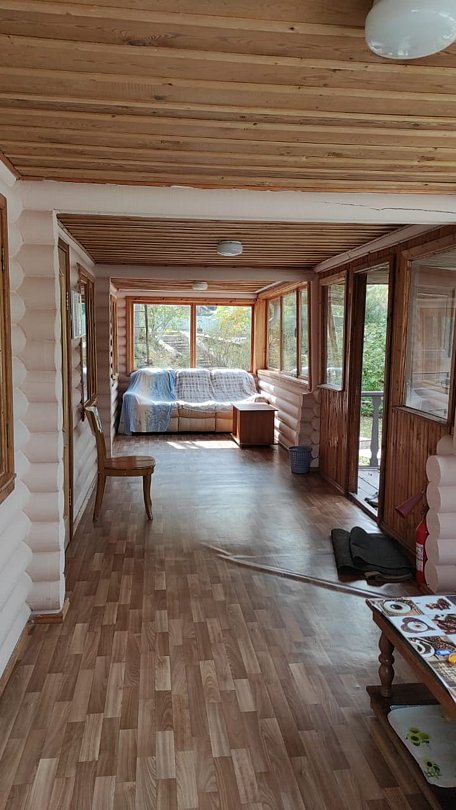 Домик из круглого бревна, рассчитан на пребывание большой семьи или двух пар, с двумя двух-трех местными спальными комнатами, выходящими на общую остекленную веранду, используемую как гостевую.
