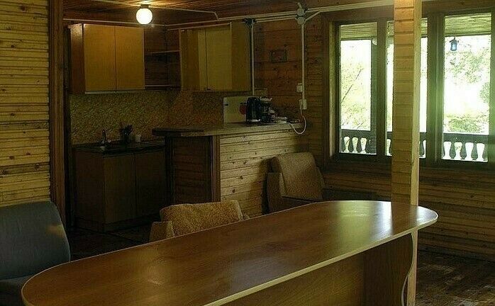 2-х этажный деревянный дом, состоящий из трех 2-3 местных комнат, с двумя балконами, большой верандой, оборудованной кухней-столовой (холодильник, печь, посуда, микроволновка), душа-туалета и большого холла с ТВ. Предоставляется белье.