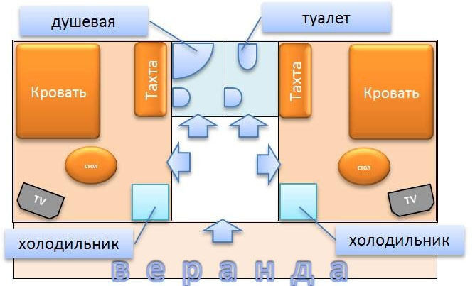 Каждый номер оборудован кроватью и шкафом. Туалеты и умывальники расположены в конце коридора. На каждом этаже расположены душевые. Предоставляется постельное белье и полотенца.