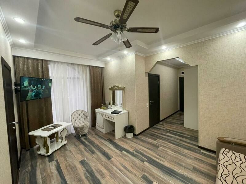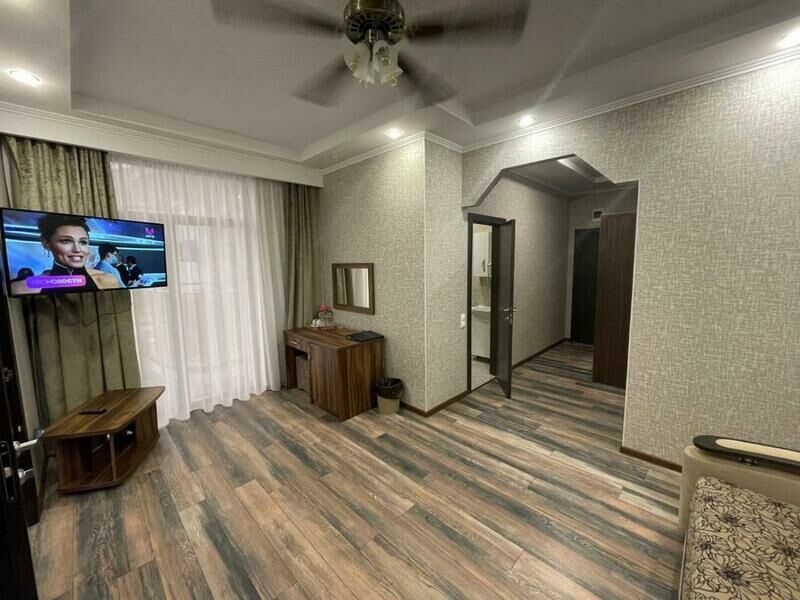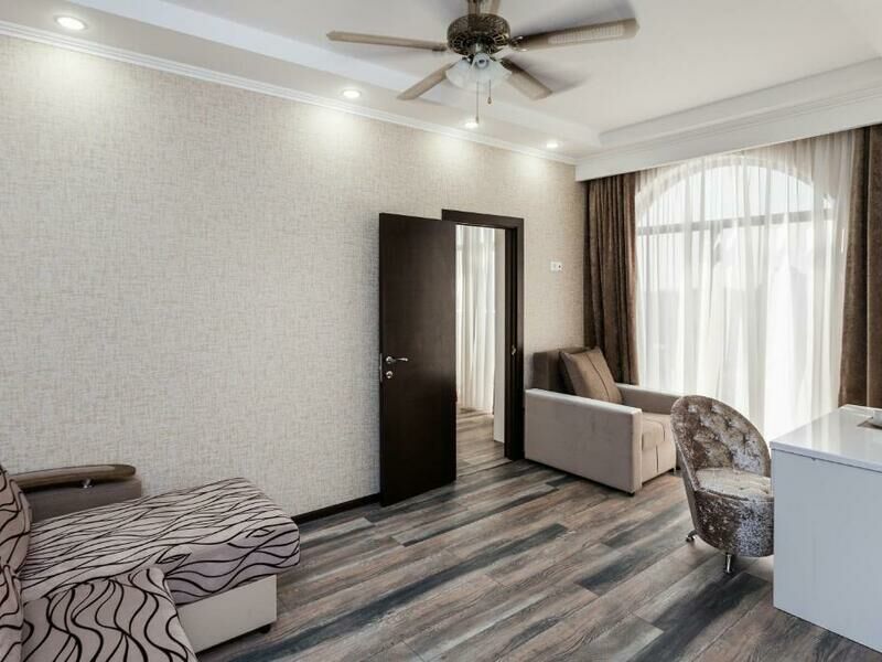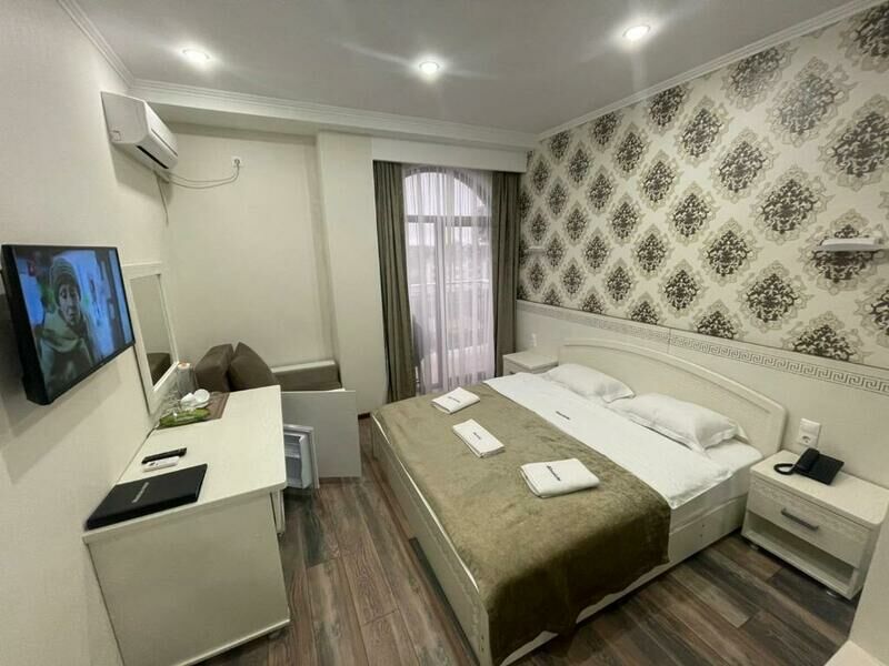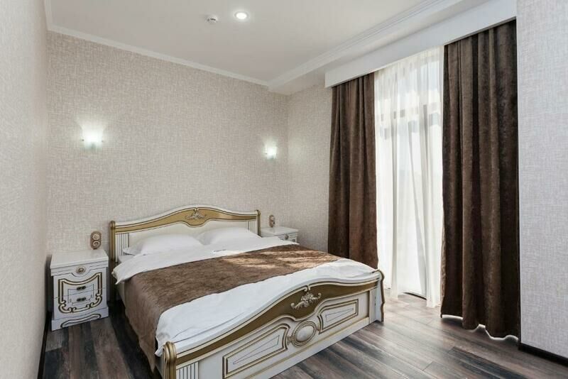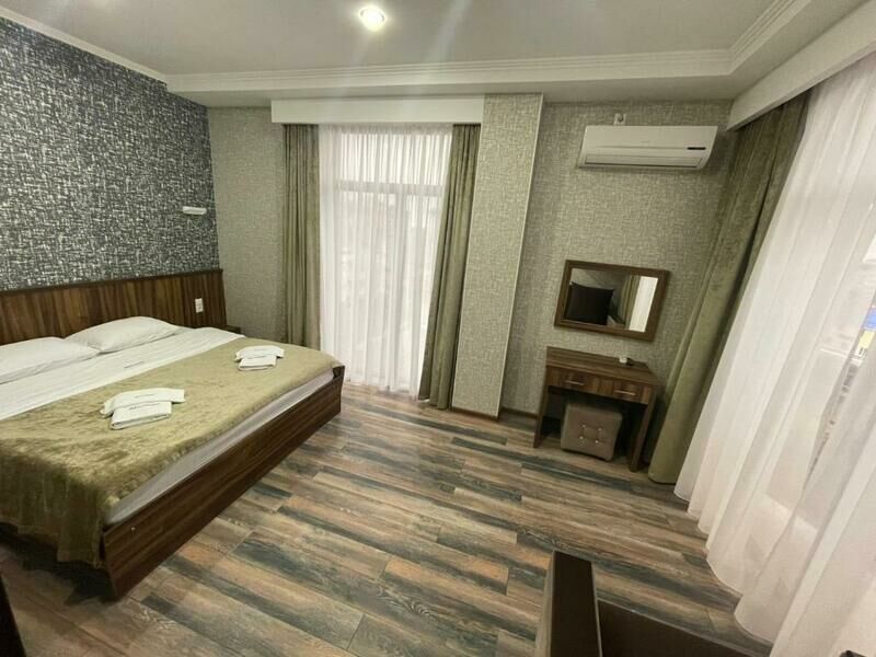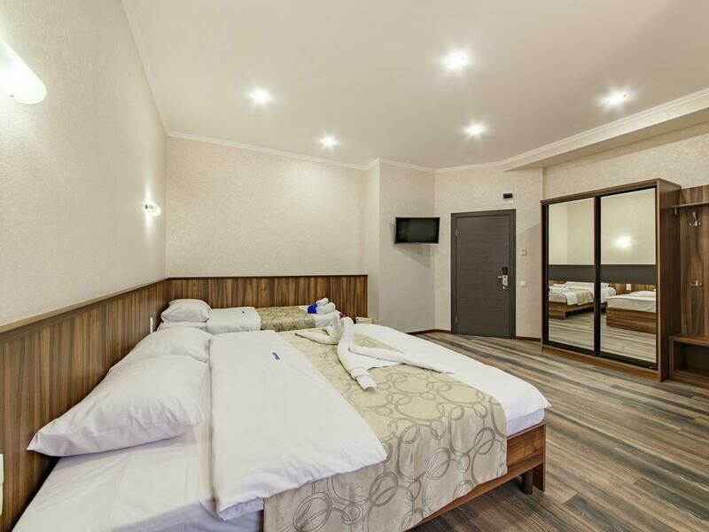 Семиэтажный корпус отеля возвышается на одной из крупных улиц поселка. Гостей ожидают двухместные номера Стандарт, Супериор и Люкс. Все номера оборудованы собственной ванной комнатой с душем, везде есть кондиционер, телевизор, мини-холодильник, фен.