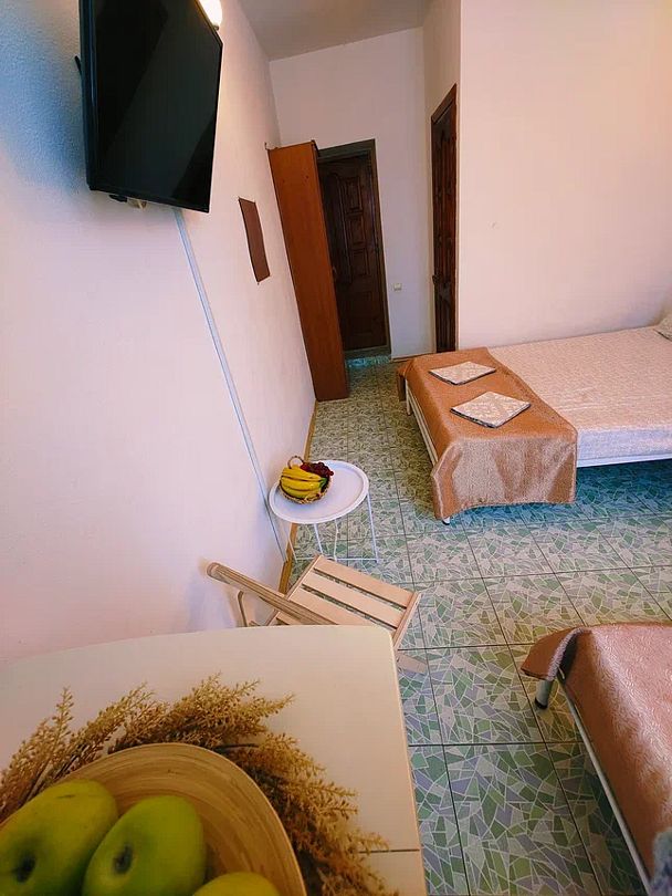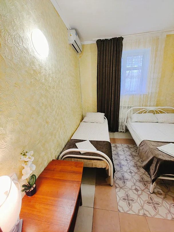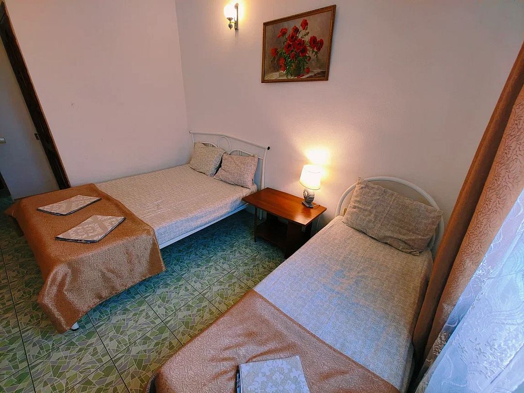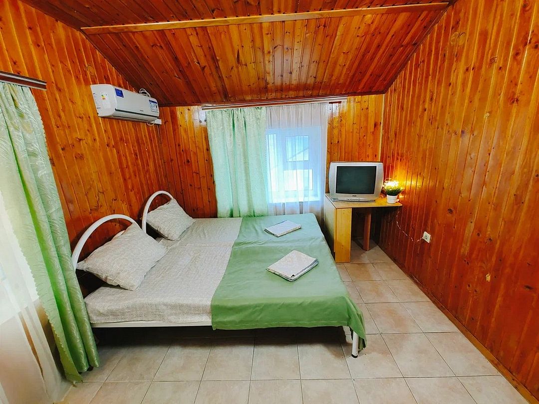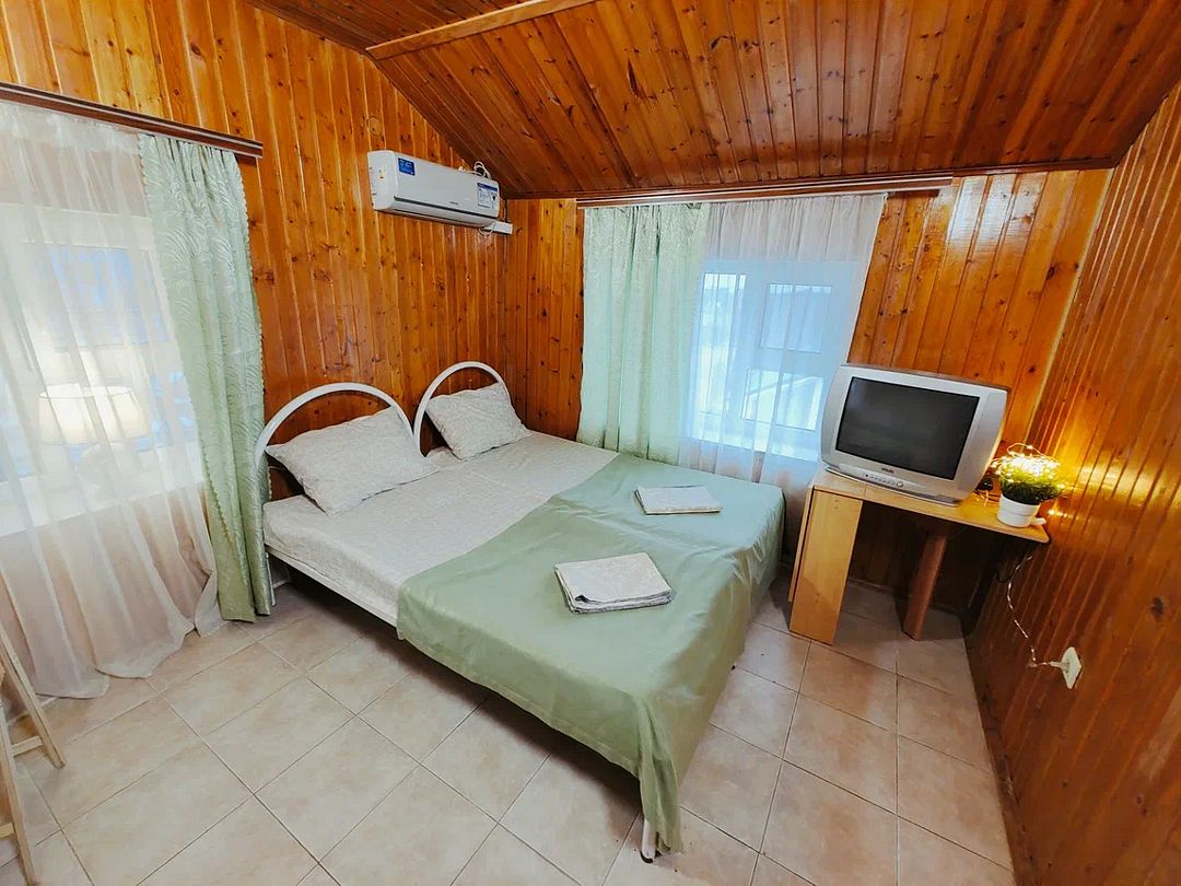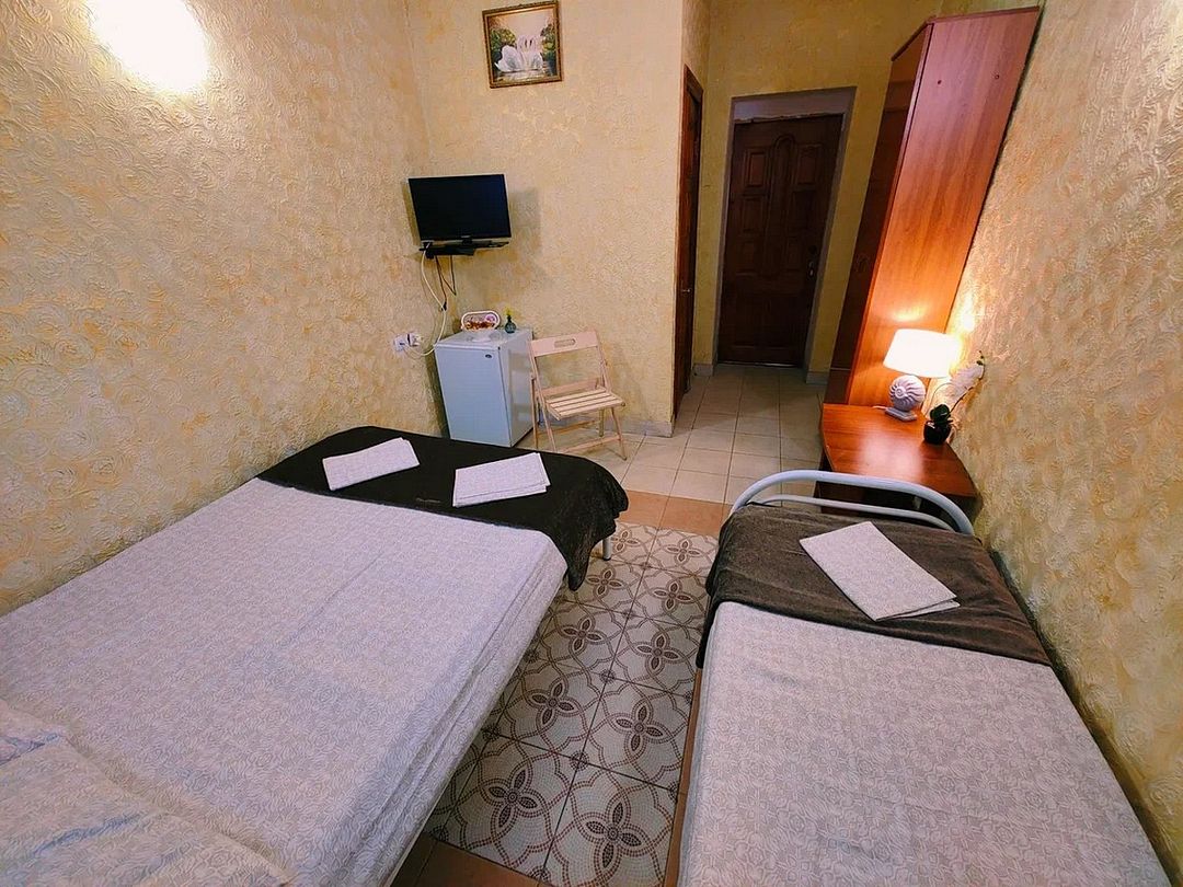 Номер оснащен: две односпальные кровати, прикроватные тумбочки, зеркало, шкаф, мини-холодильник, кондиционер, телевизор. Душ и туалет на этаже.