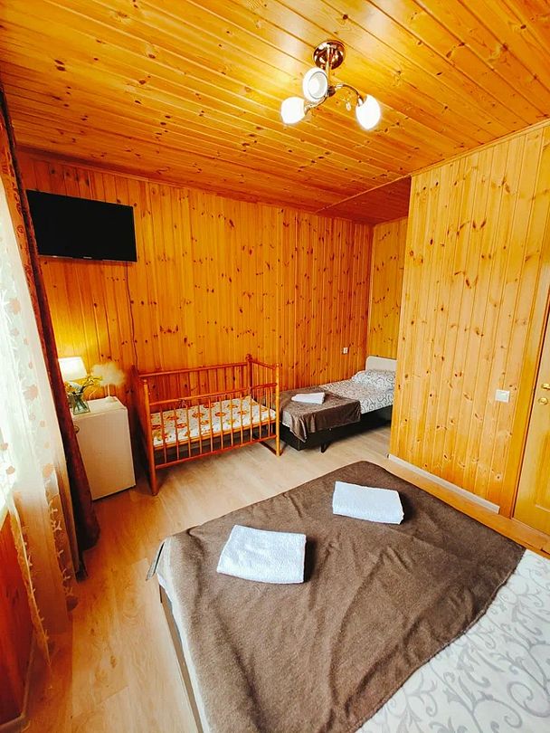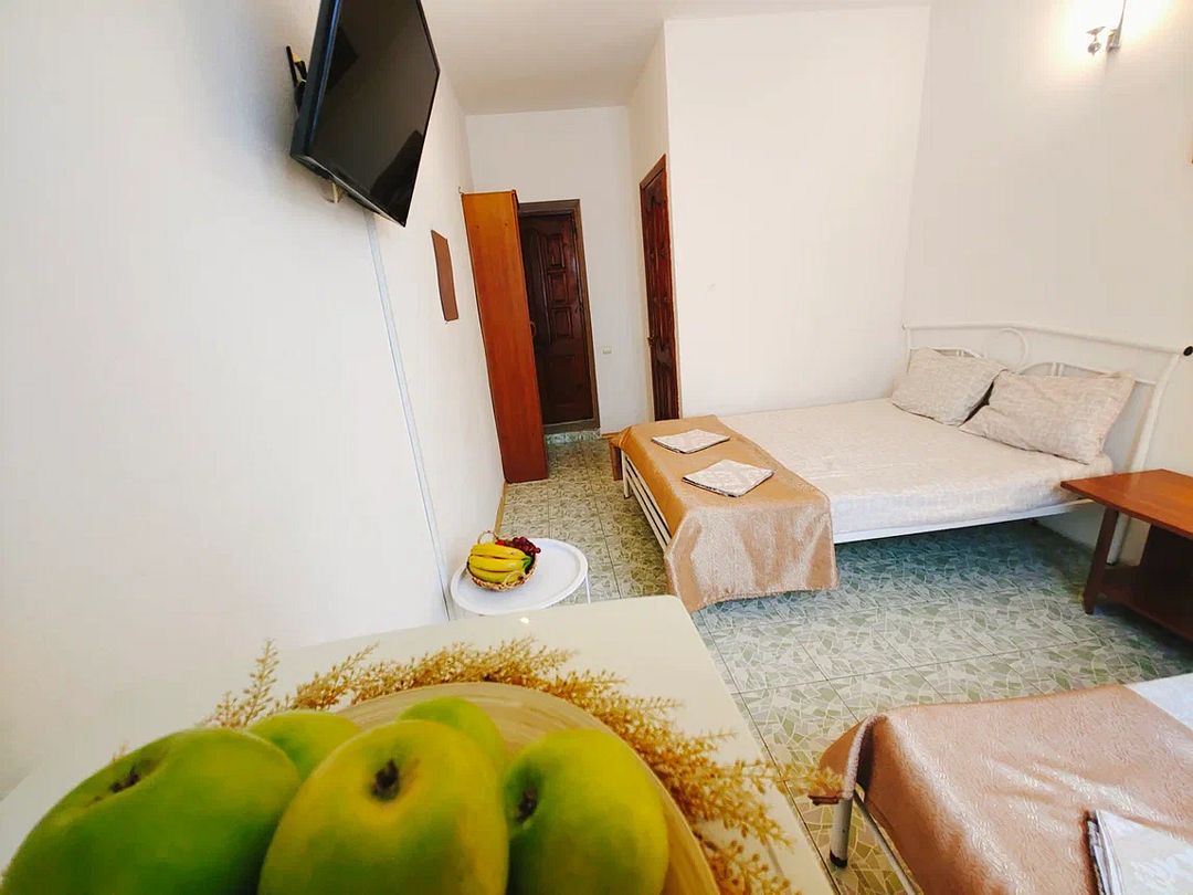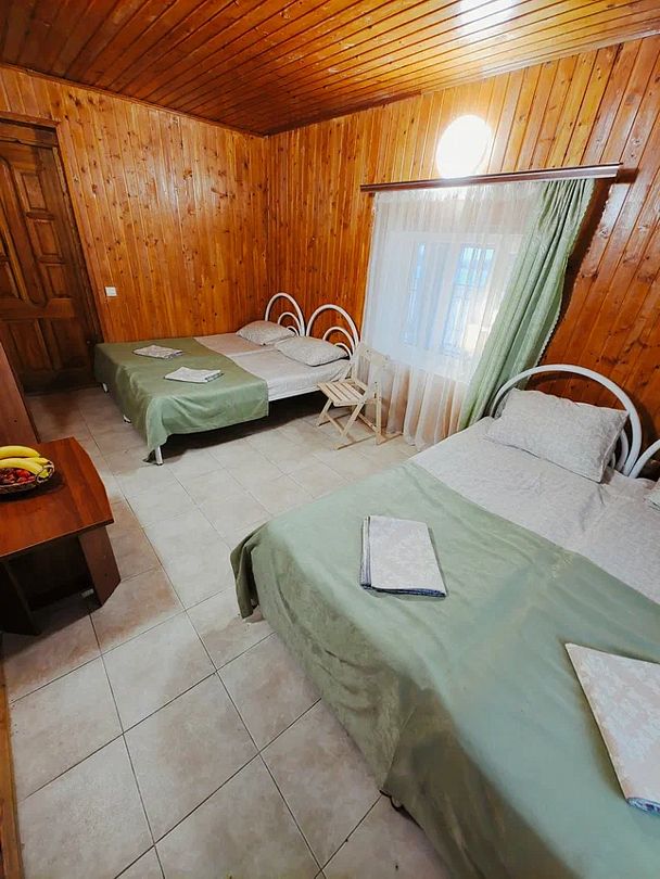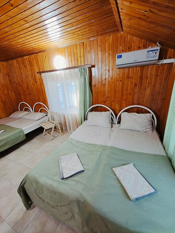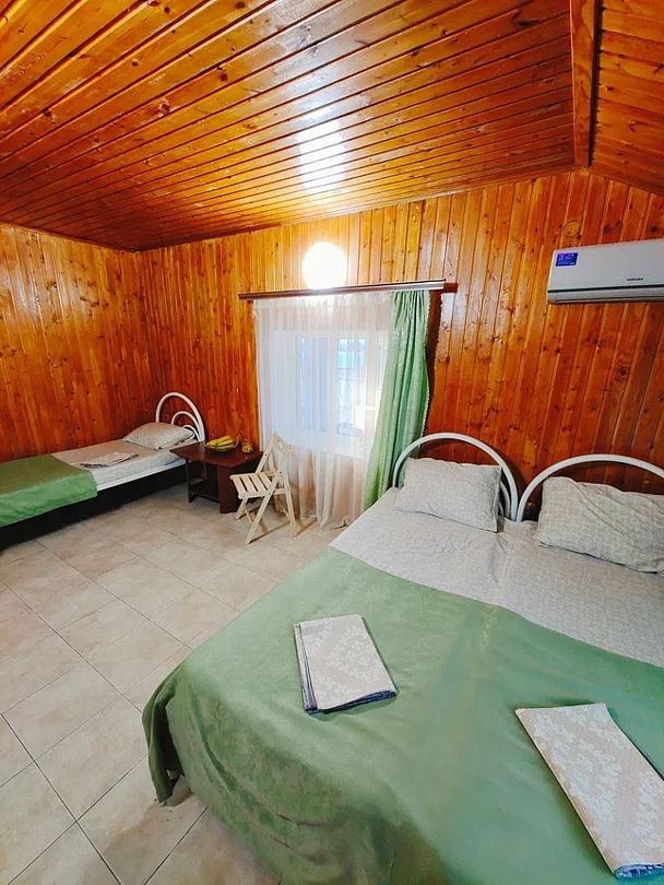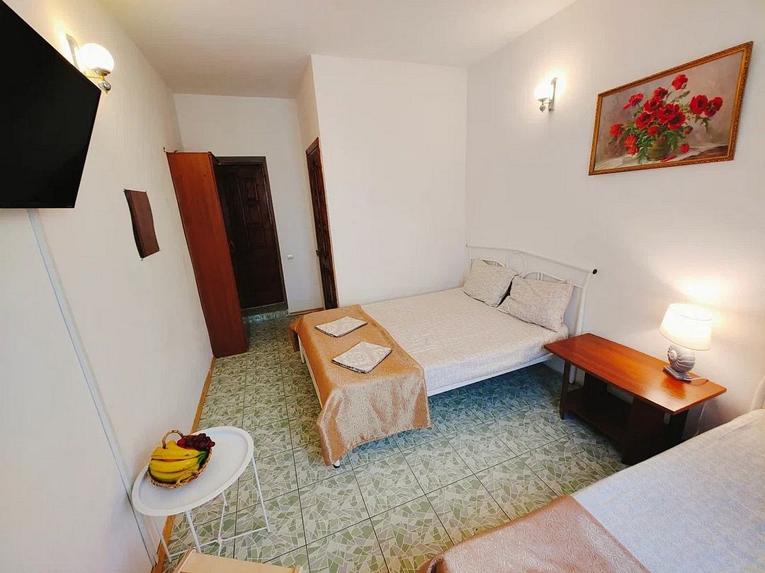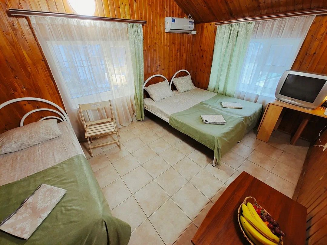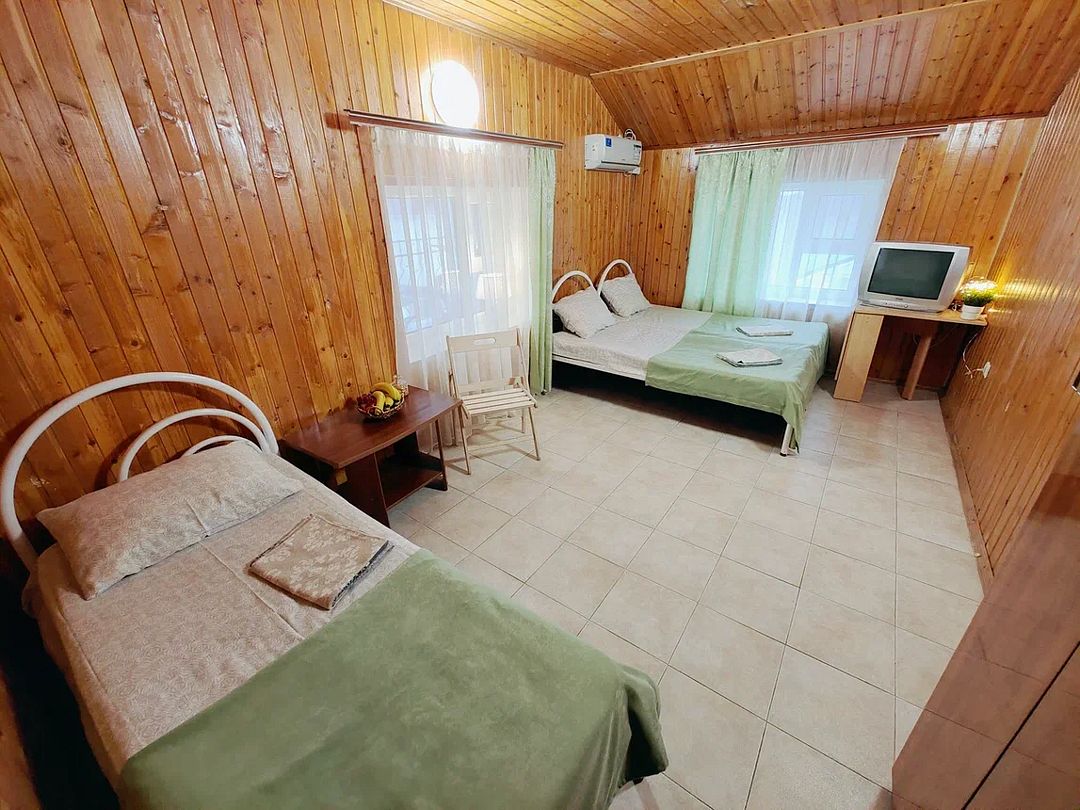 Номер оснащен: двуспальная кровать и односпальная кровать или три односпальные, прикроватные тумбочки, журнальный столик, зеркало, шкаф, кондиционер, телевизор. Душ и туалет на этаже.