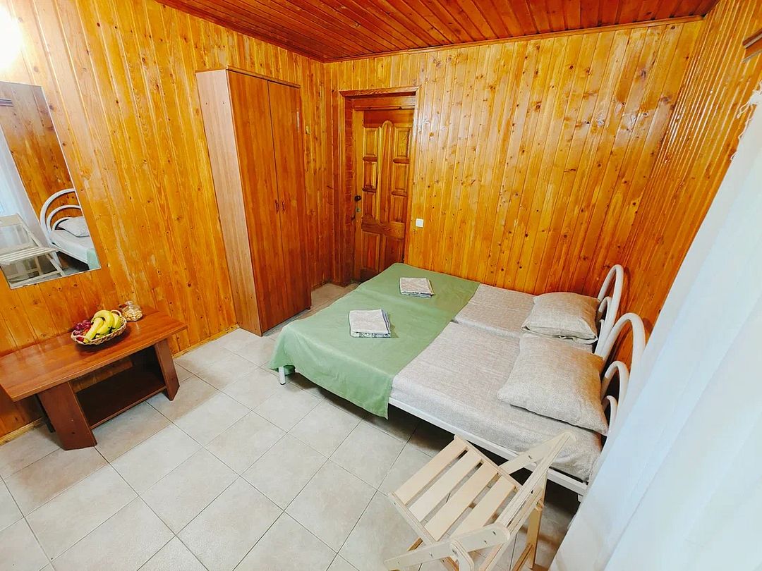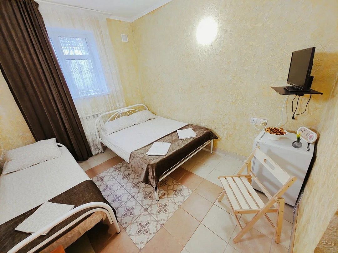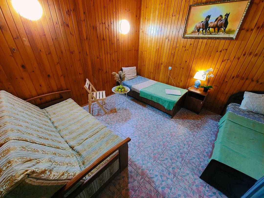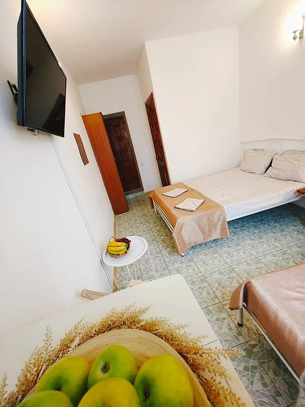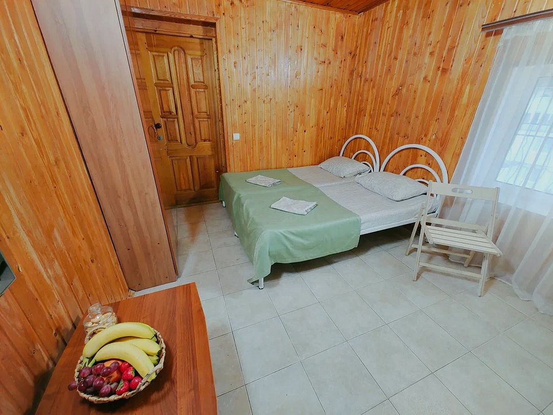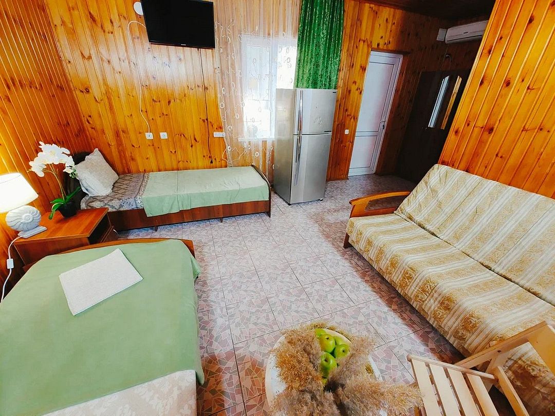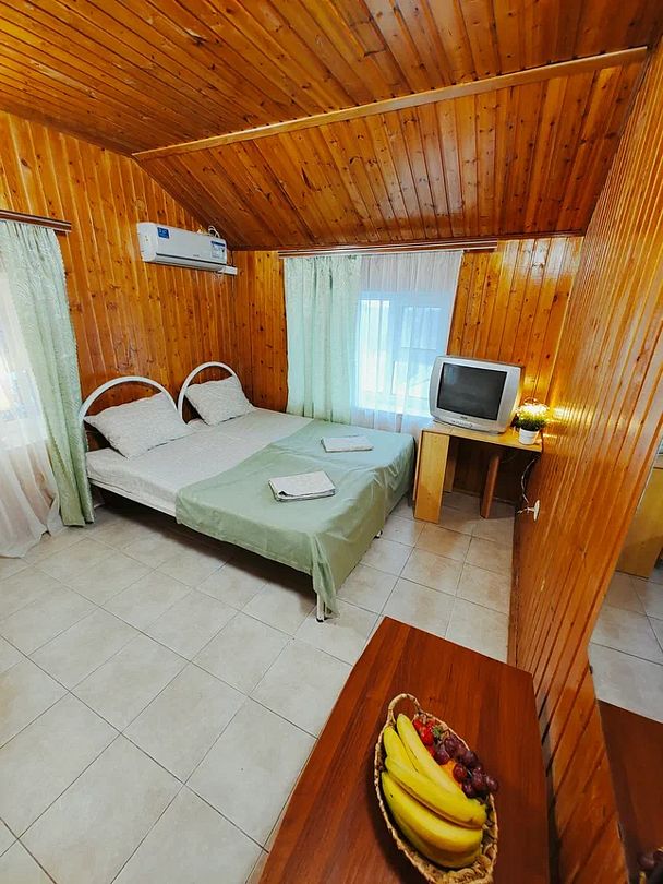 Номер оснащен: двуспальная кровать и односпальная кровать или три односпальные, прикроватные тумбочки, журнальный столик, зеркало, шкаф, кондиционер, телевизор. Душ и туалет на этаже.