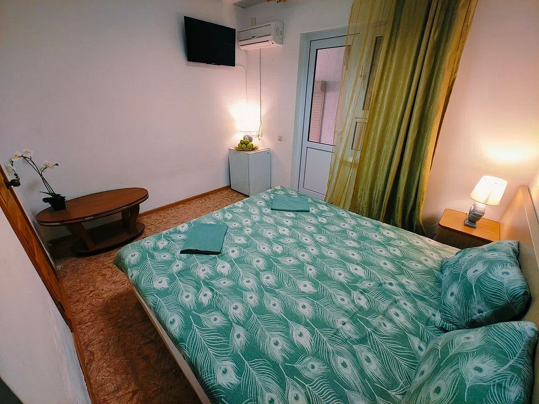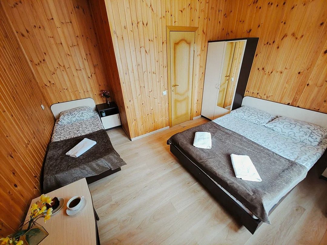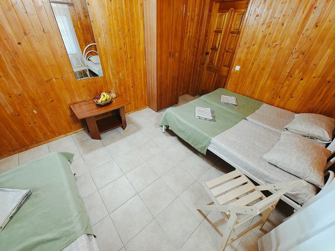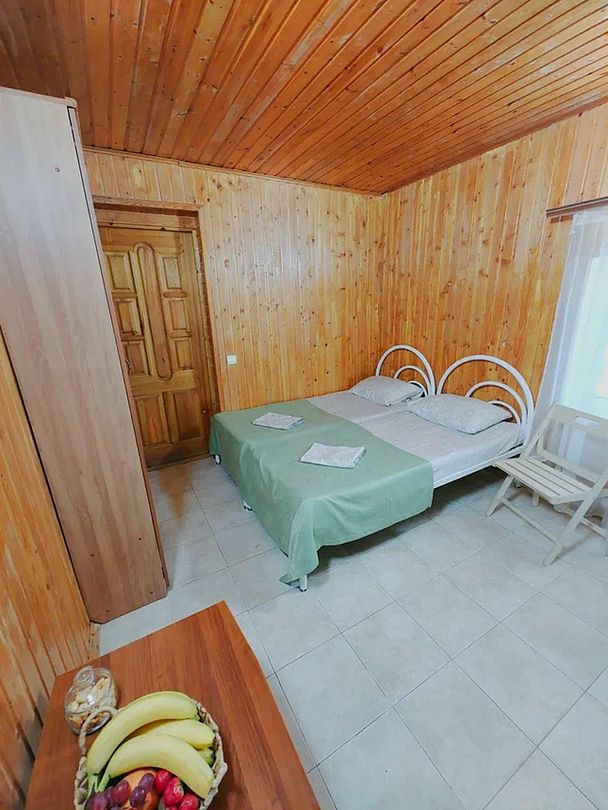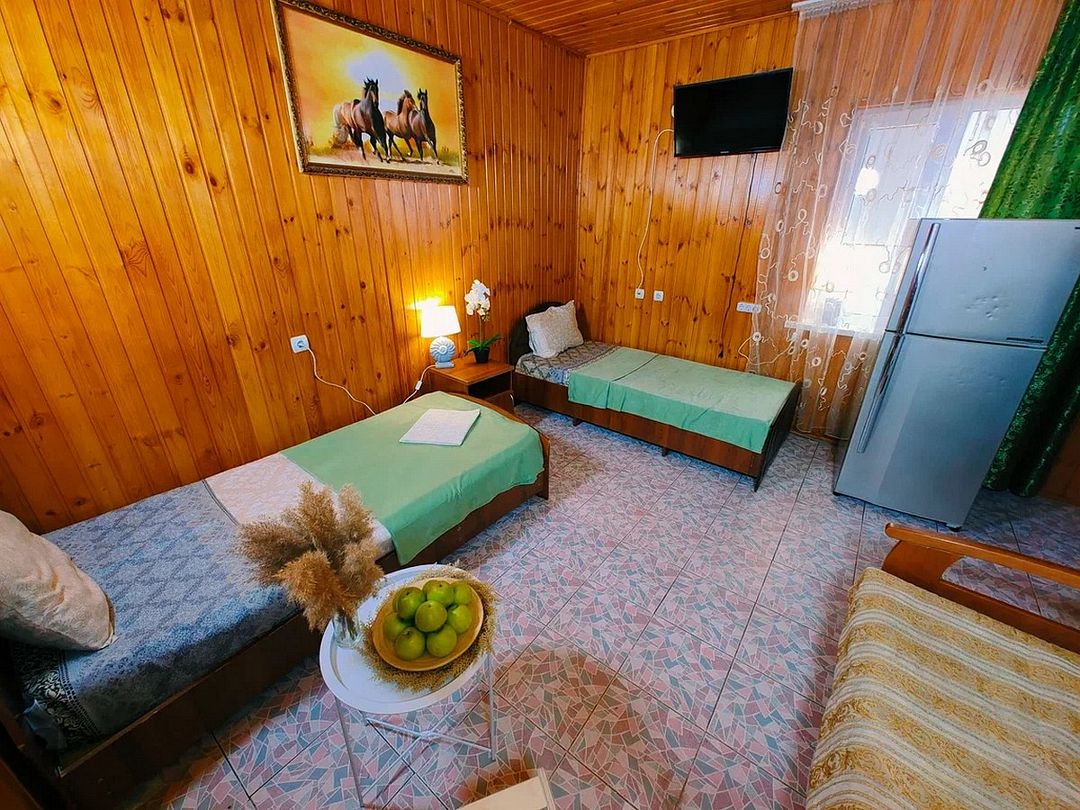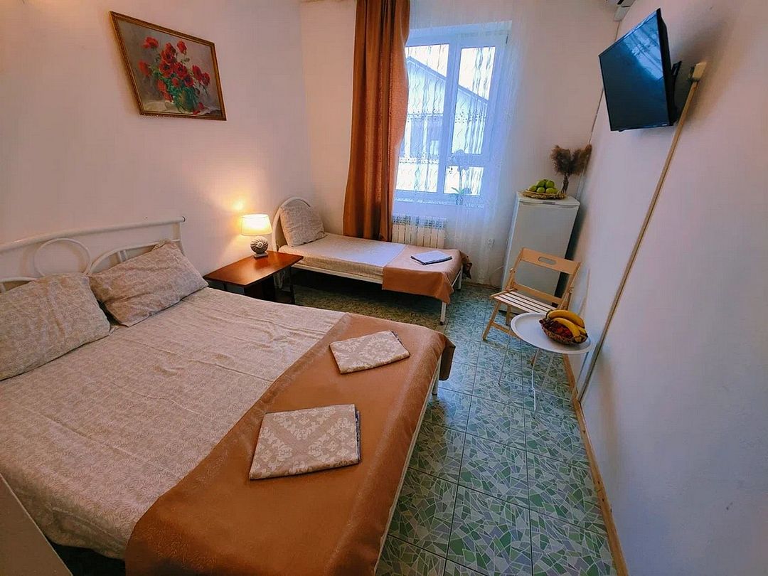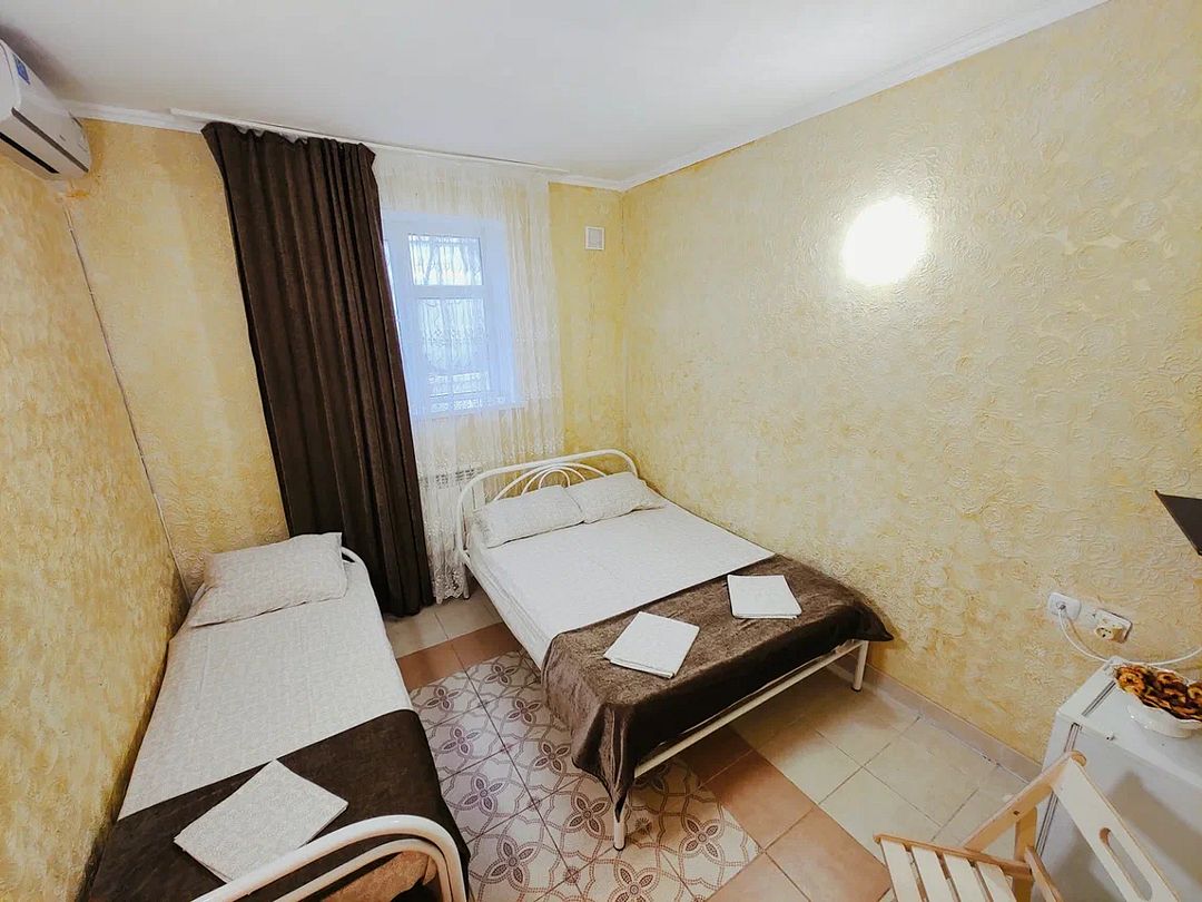 Номер оснащен: двуспальная кровать и односпальная кровать или три односпальные, прикроватные тумбочки, журнальный столик, зеркало, шкаф, кондиционер, телевизор. Душ и туалет на этаже.