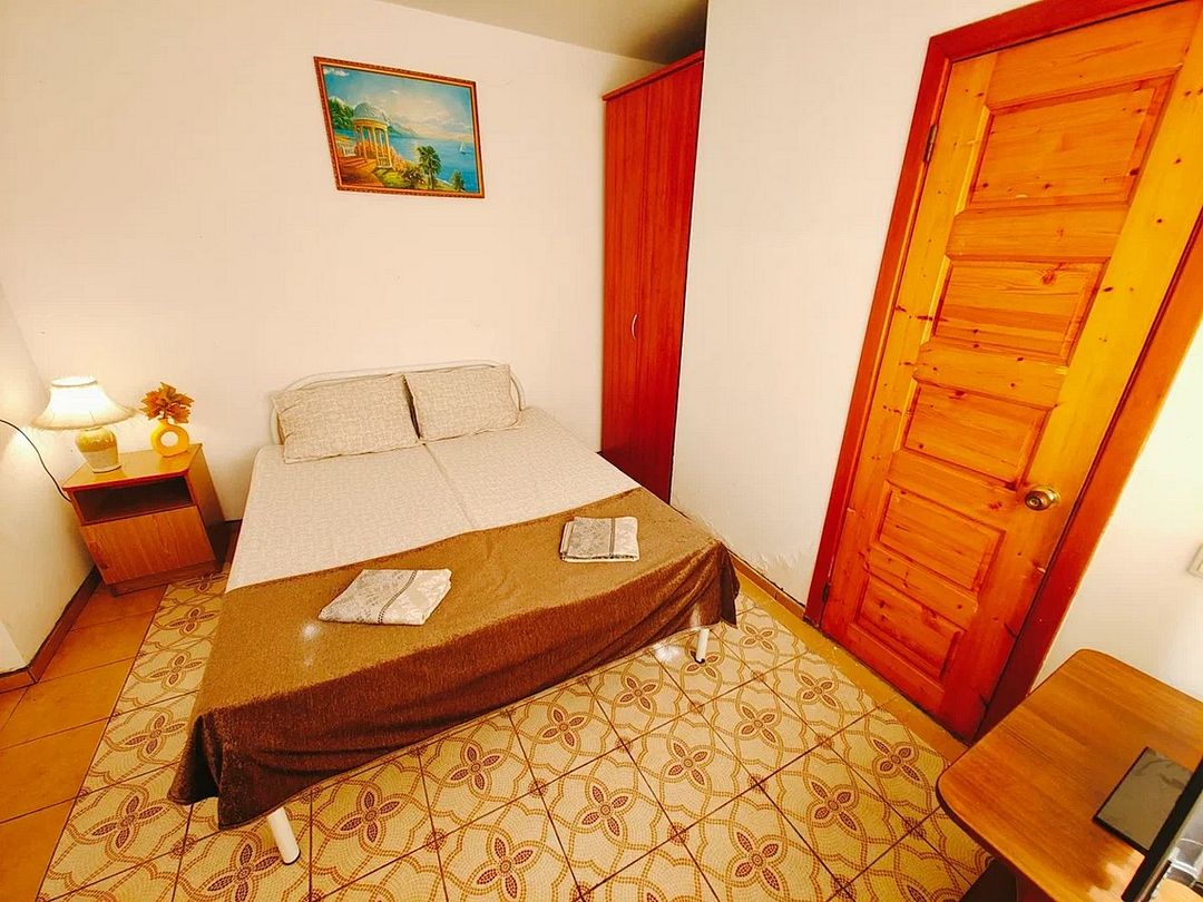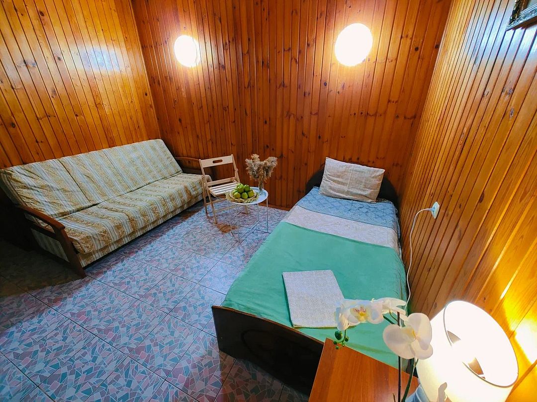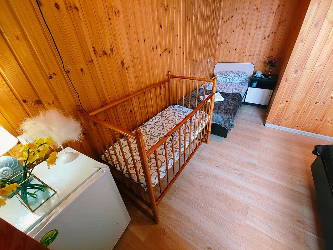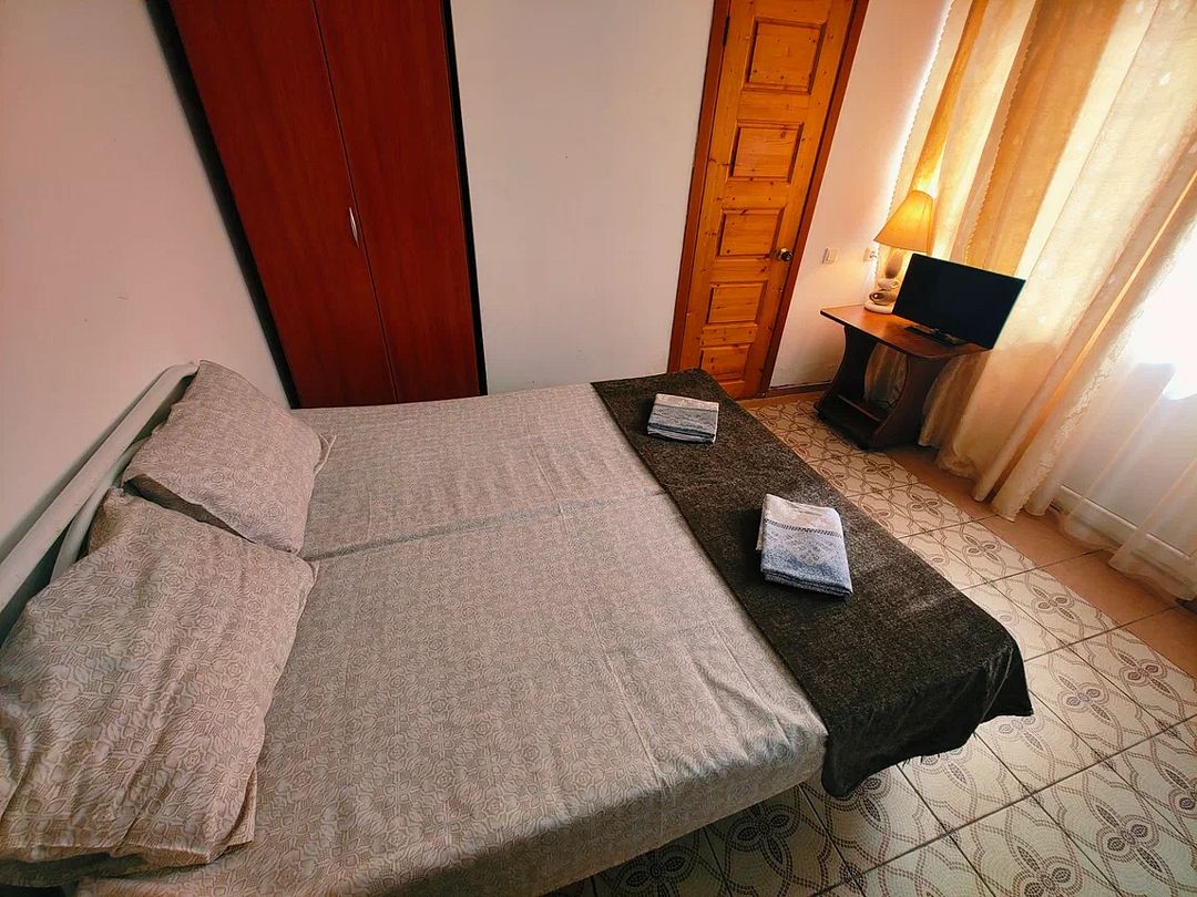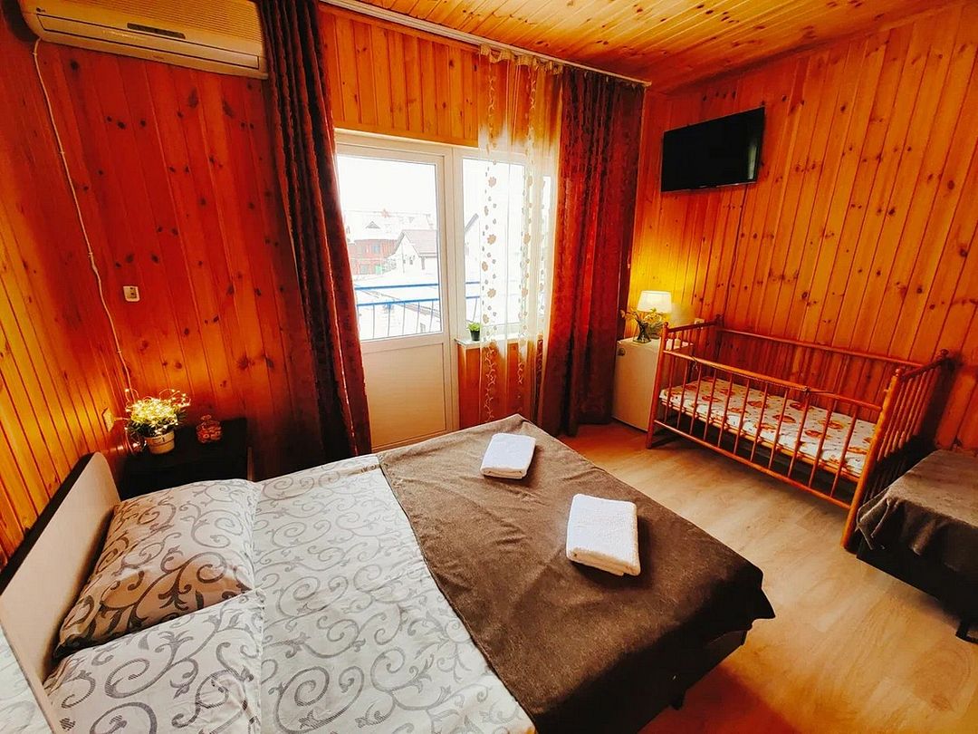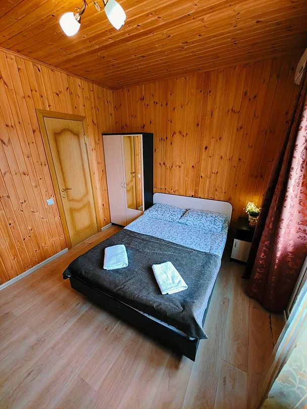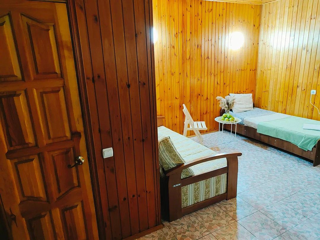 Номер оснащен: двуспальная кровать и односпальная кровать или три односпальные, прикроватные тумбочки, журнальный столик, зеркало, шкаф, кондиционер, телевизор. Душ и туалет на этаже.
