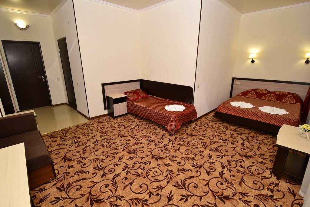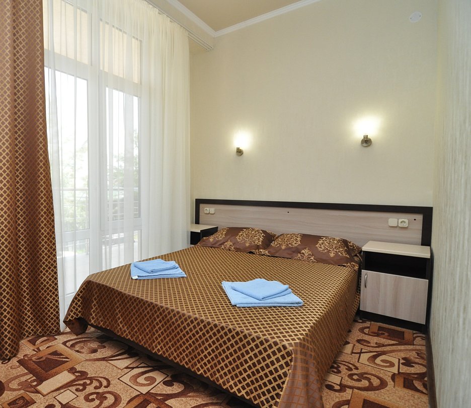 Для размещения подготовлены двухместные и трехместные номера разных категорий. Интерьеры выполнены в спокойных светлых оттенках, в некоторых комнатах есть балконы. В комнатах предусмотрены удобные кровати, необходимая мебель, телевизоры, кондиционеры, холодильники, электрочайники и фены, ванные комнаты с душем.