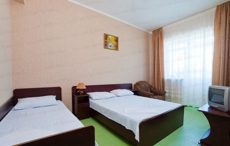 В номере: двуспальная и две односпальные кровати, кресло-кровать, платяной шкаф, прикроватные тумбочки, журнальный столик, зеркало, сплит-система, холодильник. Душ и туалет в номере.