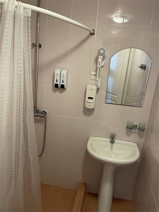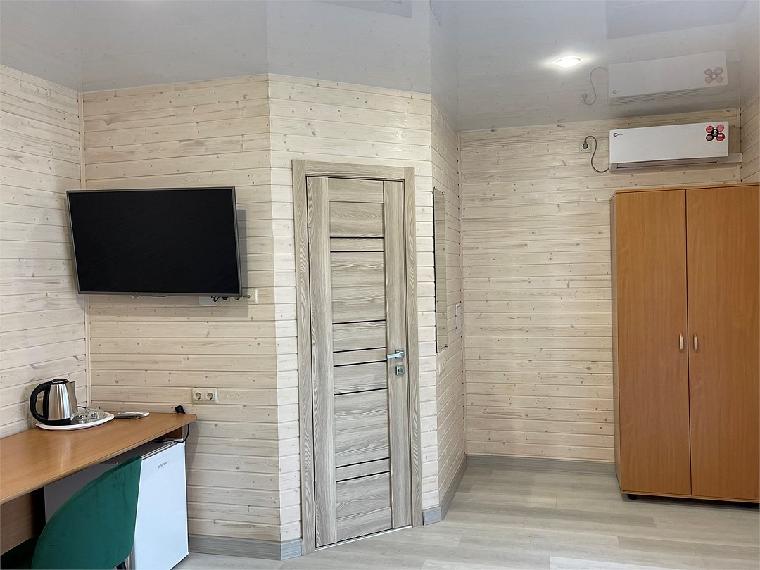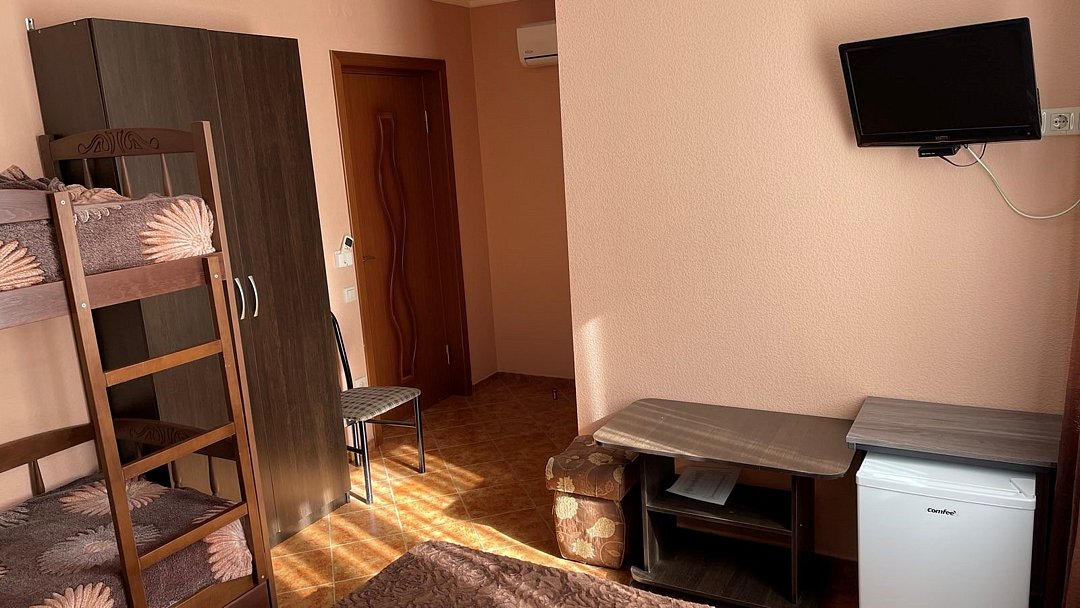 Wi-Fi, фен, душевая кабина, банные полотенца, тапочки, двуспальная кровать, шкаф для одежды, журнальный столик, зеркало, унитаз, раковина, туалетные средства, туалет, сплит-система, телевизор с плоским экраном, мини-холодильник, двухъярусная кровать, вешалки-плечикиВ номере