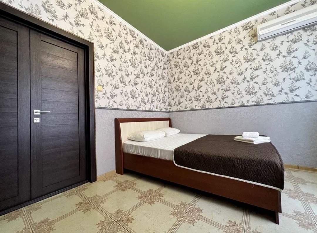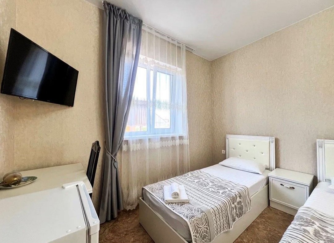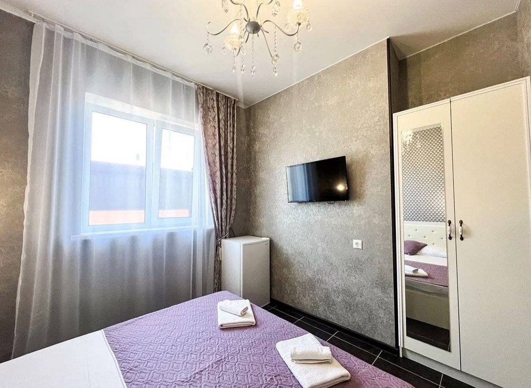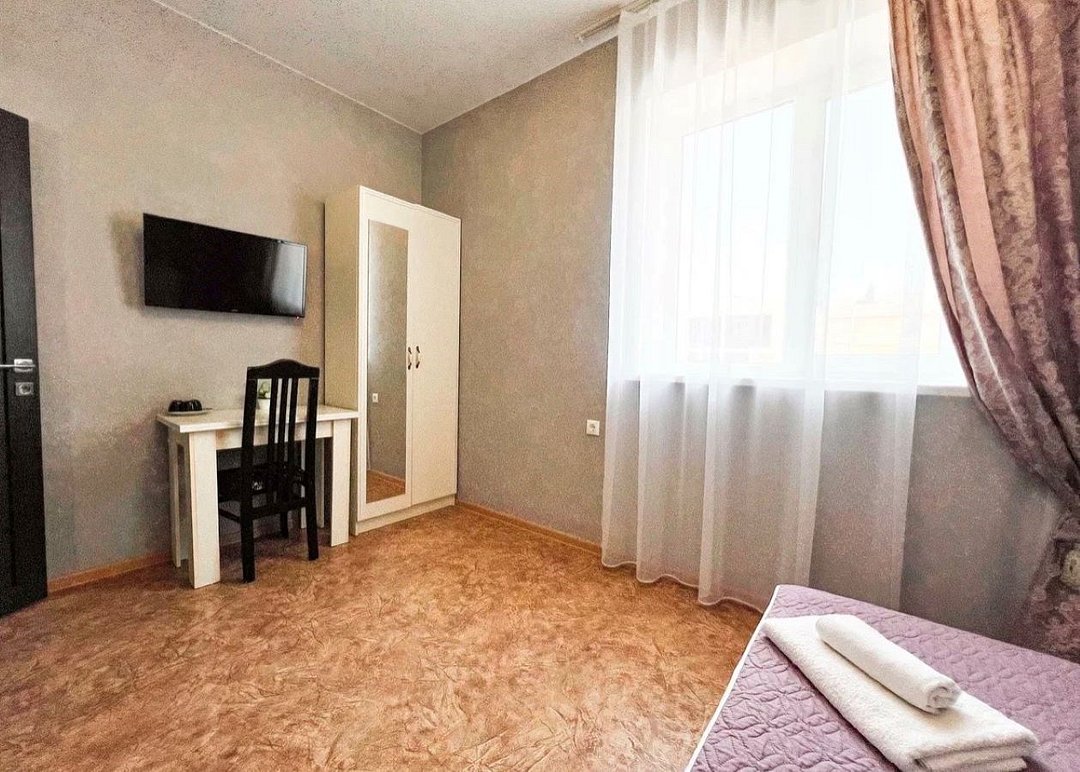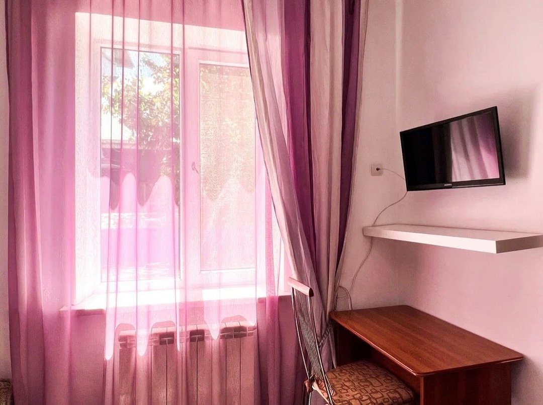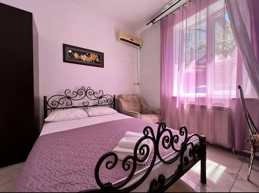 Wi-Fi, холодильник, кондиционер, фен, ванна, банные полотенца, двуспальная кровать, тумбы, шкаф для одежды, вешалки, письменный стол, зеркало, обслуживание номеров, раковина, отдельный вход в номер, вид во двор, стул, туалетные средства, туалет, телевизор с плоским экраном, москитная сеткаВ гостиничном номере
