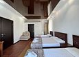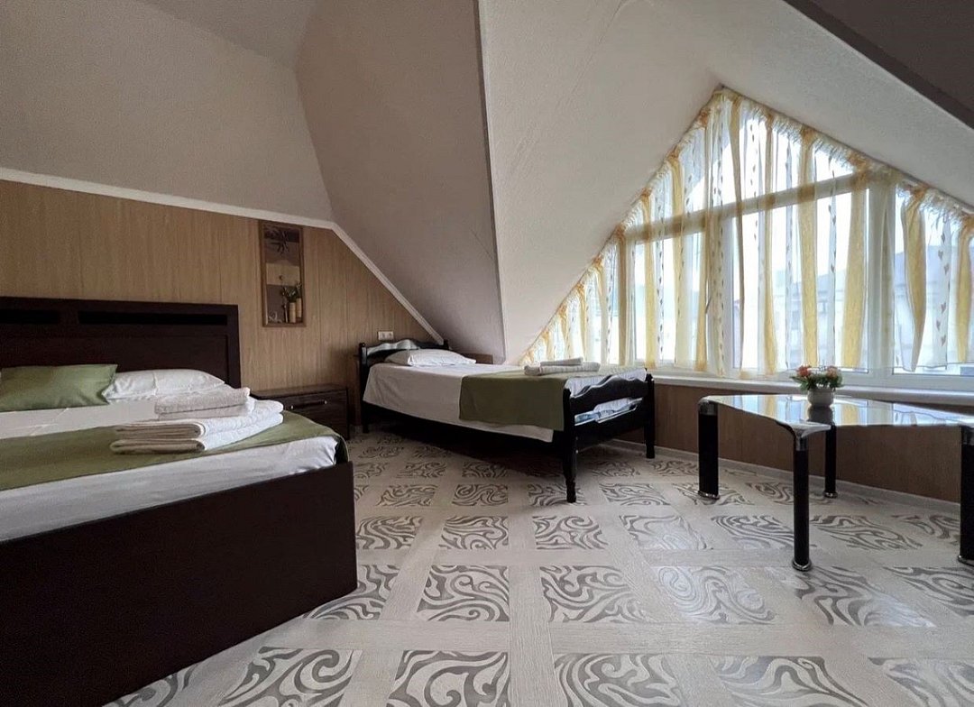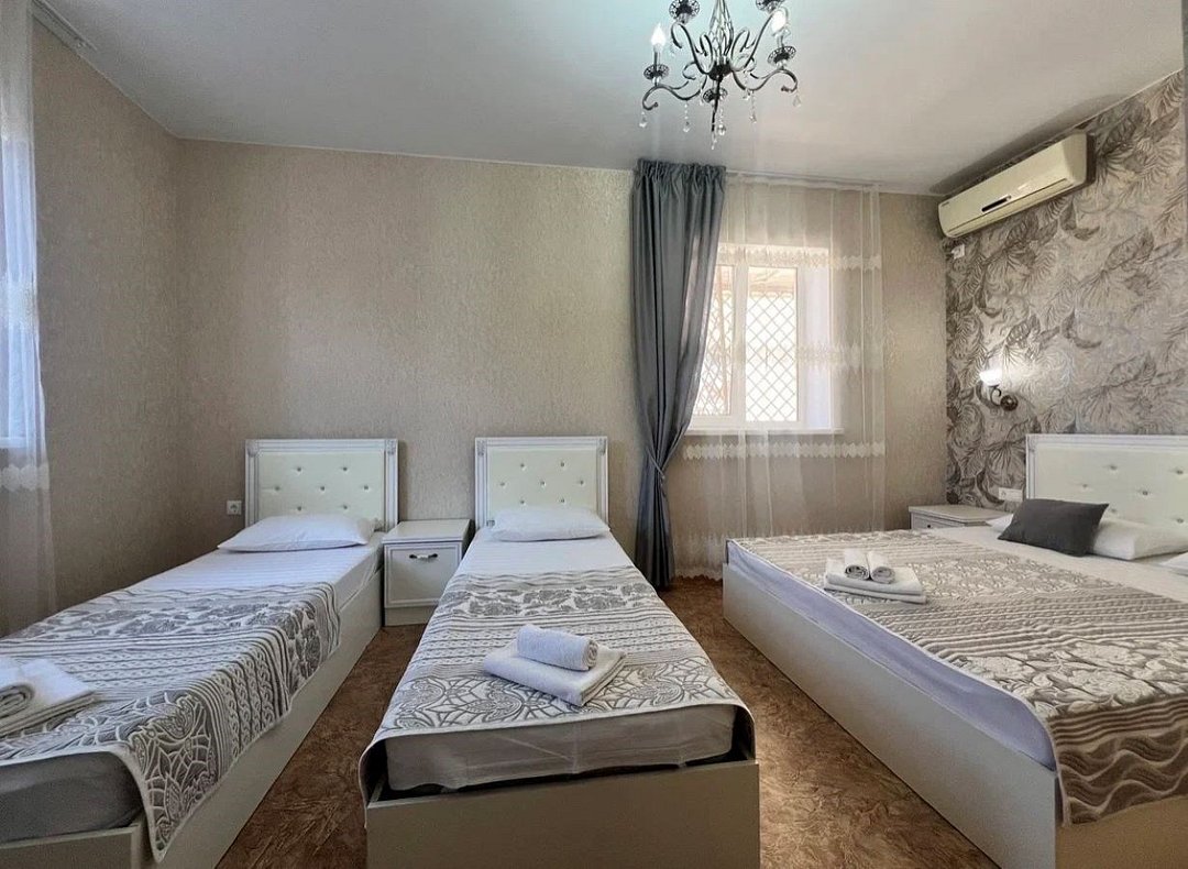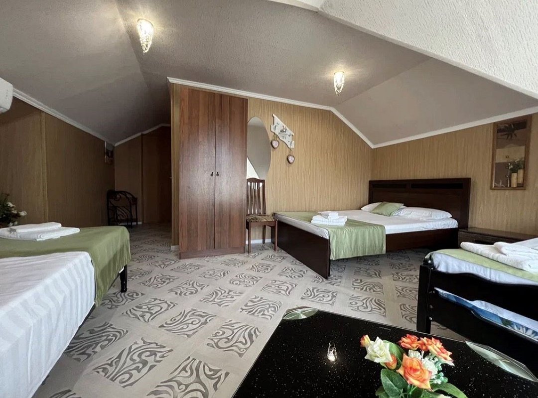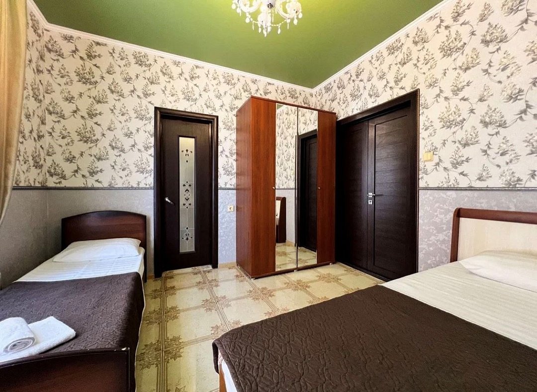 Wi-Fi, холодильник, кондиционер, фен, ванна, банные полотенца, двуспальная кровать, две односпальные кровати, шкаф для одежды, вешалки, журнальный столик, зеркало, пуфики, душ, вид во двор, тумба, туалетные средства, телевизор с плоским экраномВ гостиничном номере