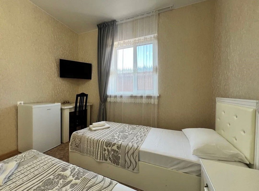 Wi-Fi, холодильник, кондиционер, фен, утюг, ванна, банные полотенца, двуспальная кровать, две односпальные кровати, тумбы, шкаф для одежды, вешалки, письменный стол, душ, вид во двор, стул, туалетные средства, телевизор с плоским экраном, пуфикВ гостиничном номере