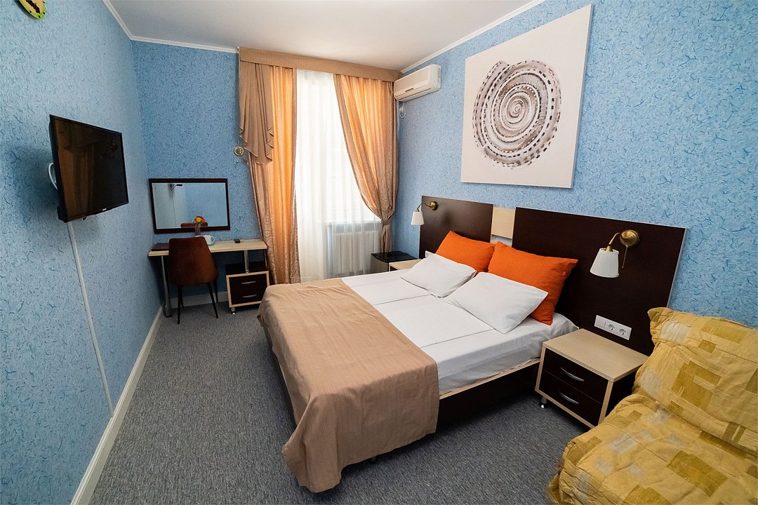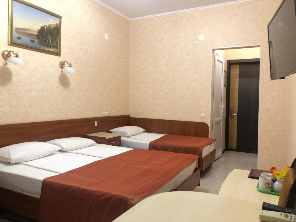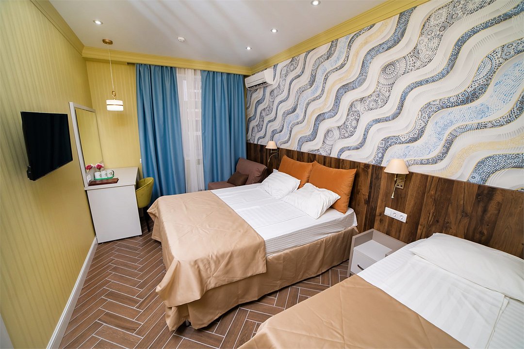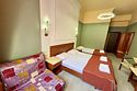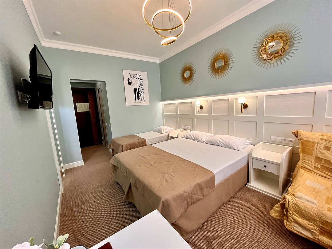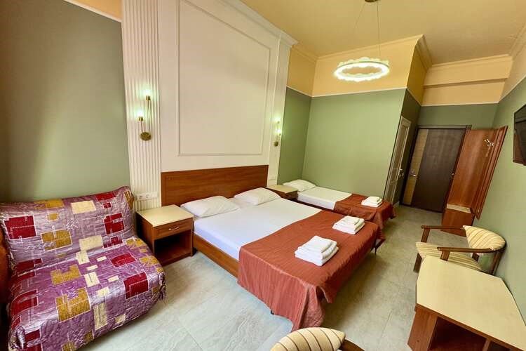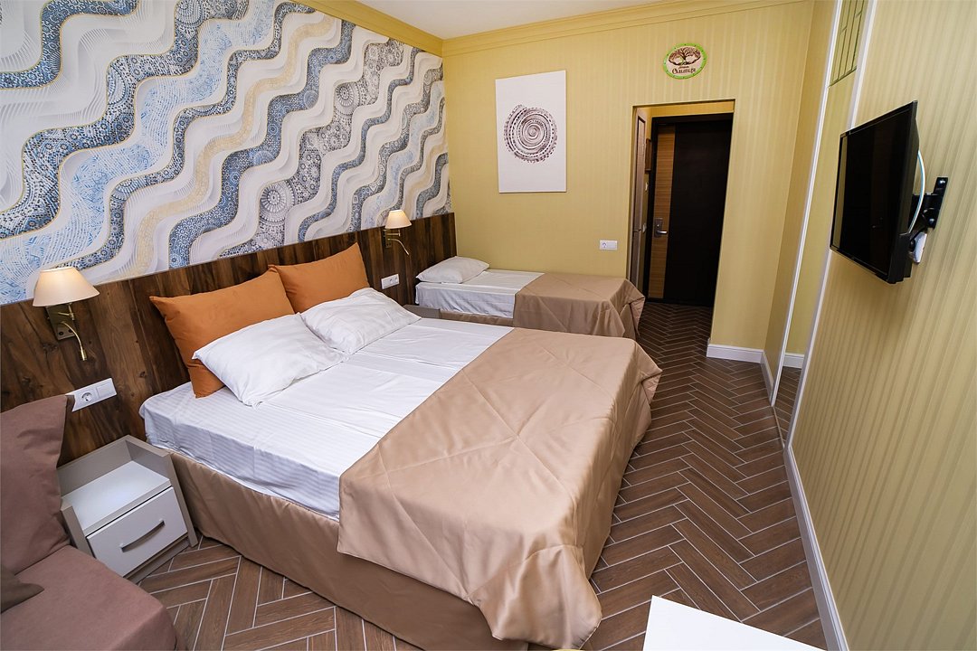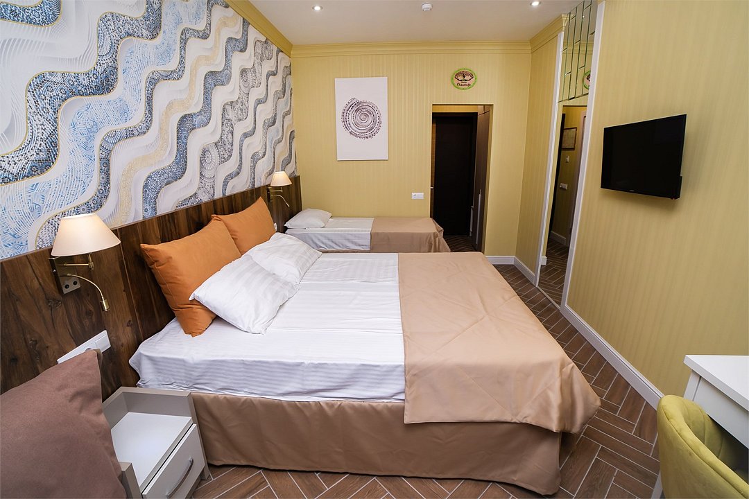Комфортный трехместный номер площадью 18 кв. м. состоит из спальни и ванной комнаты. В номерах есть возможность проживания 3 человек. Есть возможность размещения как на 1 двуспальной и 1 односпальной кровати, так и на 3-х односпальных кроватях. При проживание в данном номере взрослых с детьми действуют скидки. Есть сплит-система, мини-холодильник, сейф и телевизор. Wi-Fi работает на всей территории отеля, в том числе и в номере. Гостям предоставляются банные полотенца и полотенца для лица. Уборка номера производится ежедневно, смена постельного белья раз в 6 дней, смена полотенец раз в 3 дня. Приятного отдыха!Услуги и удобства