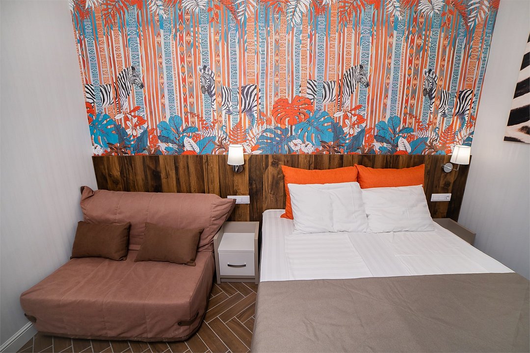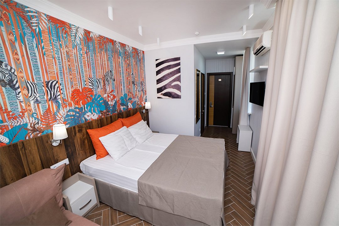 Четырехместные номера Smart создавались зимой-весной 2022 года. С площадью 18 кв. м. они состоят из спальни и ванной комнаты. В номерах есть возможность проживания 3-4 человек. Все номера с двуспальной, односпальной кроватью и кресло-кроватью. Есть сплит-система, мини-холодильник, телевизор и сейф. Wi-Fi работает на всей территории отеля, в том числе и в номере. Гостям предоставляются банные полотенца и полотенца для лица. Уборка номера производится ежедневно, смена постельного белья раз в 6 дней, смена полотенец раз в 3 дня. Приятного отдыха!Услуги и удобства
