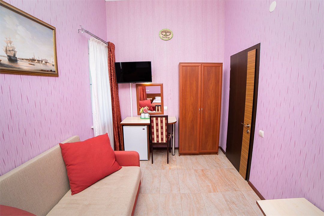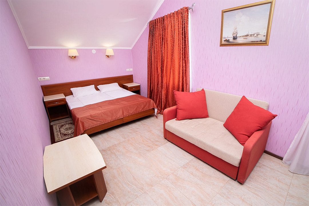 Новые четырехместные номера Smart с диваном создавались зимой-весной 2022 года. С площадью 15 кв. м. они состоят из спальни и ванной комнаты. В номерах есть возможность проживания 2-4 человек. Все номера с двуспальной кроватью и двуспальным диваном Есть сплит-система, мини-холодильник, телевизор и сейф. Wi-Fi работает на всей территории отеля, в том числе и в номере. Гостям предоставляются банные полотенца и полотенца для лица. Уборка номера производится ежедневно, смена постельного белья раз в 6 дней, смена полотенец раз в 3 дня. Приятного отдыха!Услуги и удобства