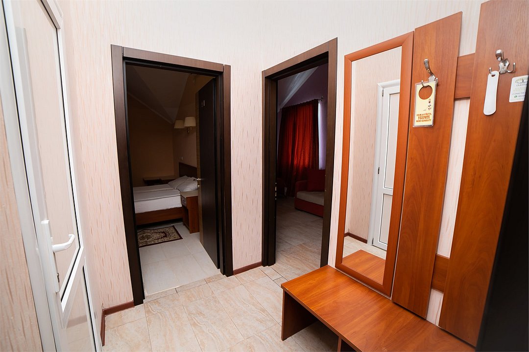 Комфортный двухкомнатный номер площадью 30 кв. м. состоит из 2 изолированных спален, коридора и ванной комнаты. В номере есть возможность проживания до 4-6 человек. В номере 1 двуспальная кровать, двуспальный диван, а также 2 односпальные кровати или двуспальный диван. Есть сплит-система, мини-холодильник и телевизор. Wi-Fi работает на всей территории отеля, в том числе и в номере. Гостям предоставляются банные полотенца и полотенца для лица. Уборка номера производится ежедневно, смена постельного белья раз в 6 дней, смена полотенец раз в 3 дня. Приятного отдыха!Услуги и удобства