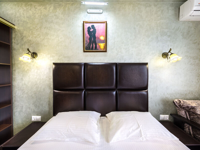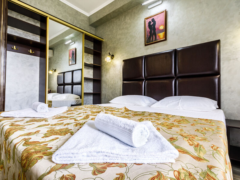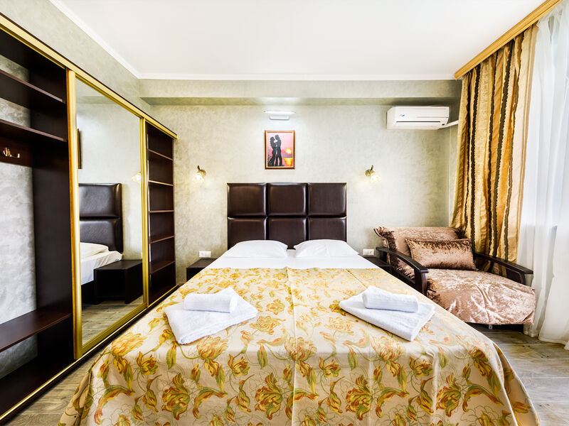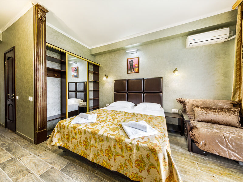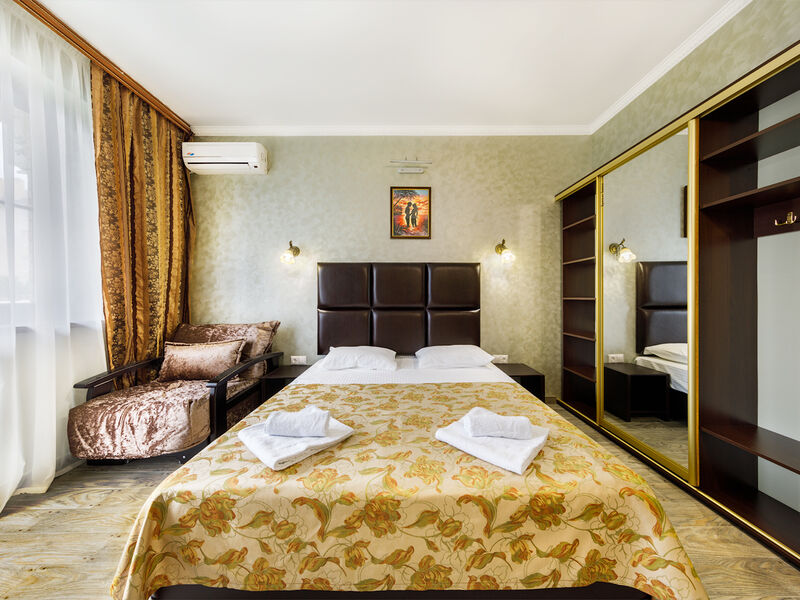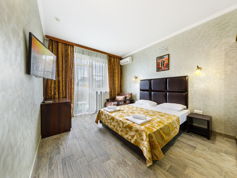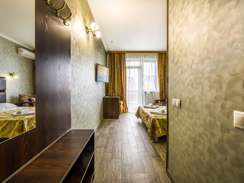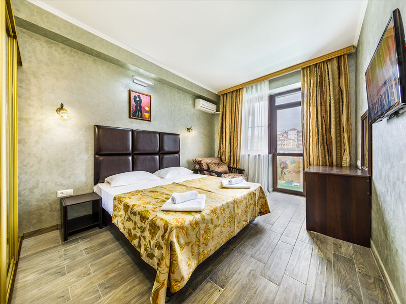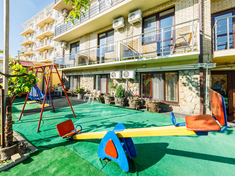 Отель располагает собственной территорией в 0,05 га, изолированной от посторонних, тщательно ухоженной и распланированной. На ней хватает места для удобных и уютных зон отдыха. Жилой фонд четырехэтажного здания отеля (без лифта) включает в себя 34 однокомнатных номера категории «полулюкс» с разным количеством мест. Все эти номера прекрасно меблированы и обеспечены отдельными санузлами с душевой кабиной, укомплектованными феном и другими удобствами. В каждом из номеров есть набор необходимой бытовой техники: сплит-система, мини- холодильник, электрический чайник с набором посуды, телевизор и Wi-Fi. Все номера отеля имеют собственные балконы.