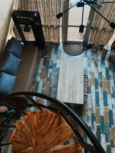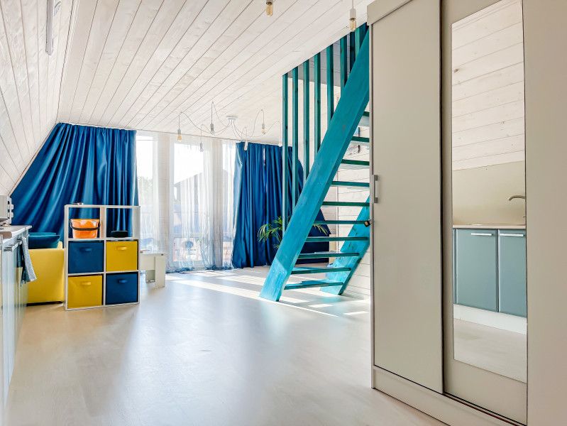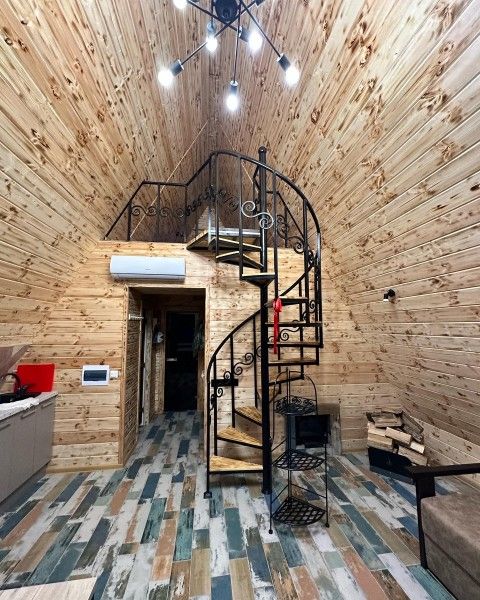 Винтовая лестница ведет на второй этаж с уютной спальней