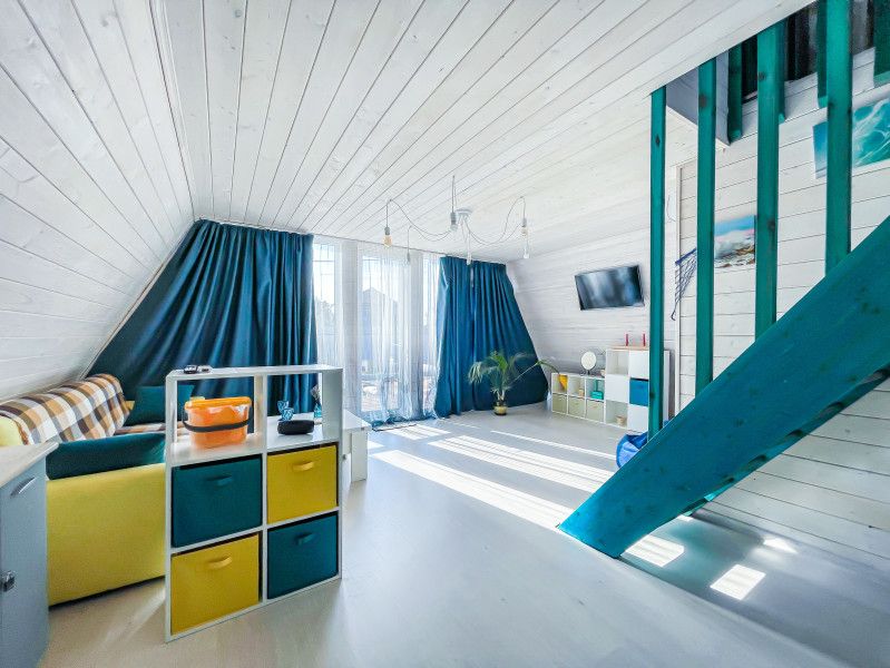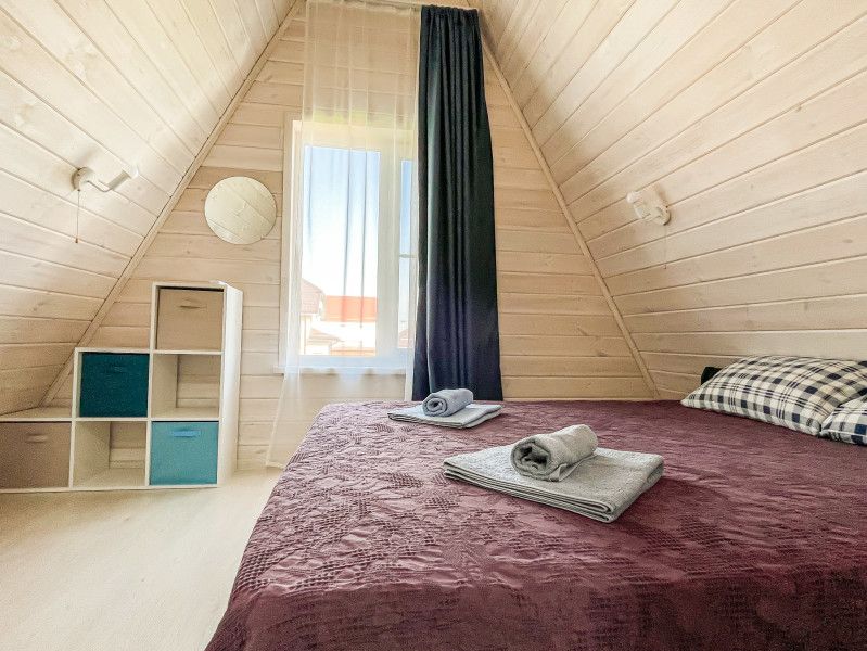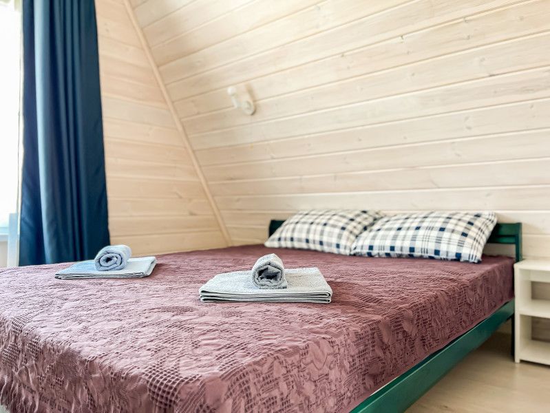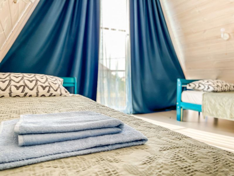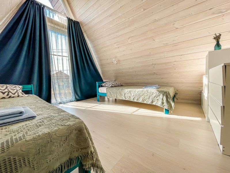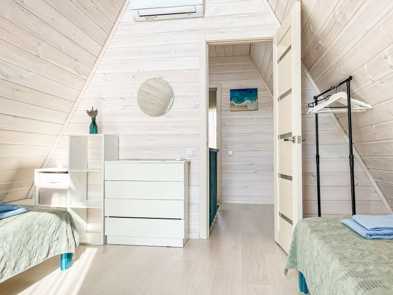 Второй этаж включает в себя 2 жилые комнаты, с двуспальной кроватью в одной и двумя односпальными в другой.