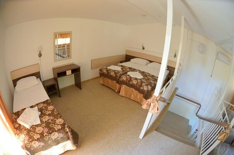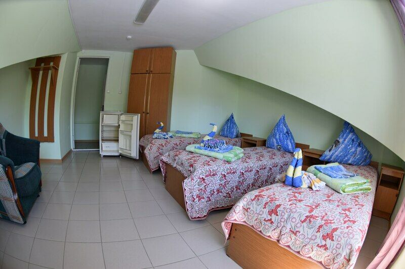 Оснащение номера: одна двухспальная кровать, одна полутороспальная, сплит-система, холодильник, ЖК-телевизор, сейф, туалетная комната с душевой кабиной.