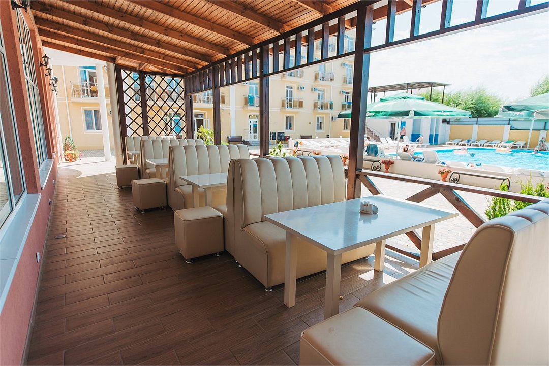 Отель обеспечивает своим гостям полноценное питание. Столовая расположена прямо в отдельном корпусе. В лобби есть также бар с алкогольными и безалкогольными напитками.