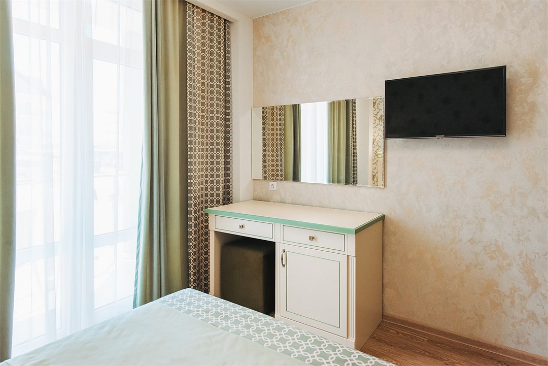 телевизор, светильник, фен, банные полотенца, пляжные полотенца, косметические средства, балкон, две односпальные или большая двуспальная кровать, тумбы, шкаф для одежды, зеркало, унитаз, раковина, душ, кресло, туалетный столик, туалетный столик, сплит-система, сушилка для белья, мини-холодильник, москитная сетка, номер для некурящих, пуфик, кресло-кровать, уборка номера, вешалки-плечики, прачечная (за дополнительную плату)В гостиничном номере