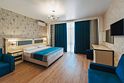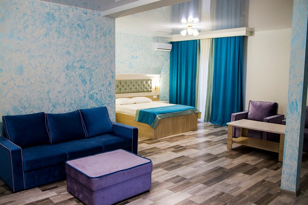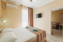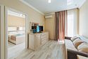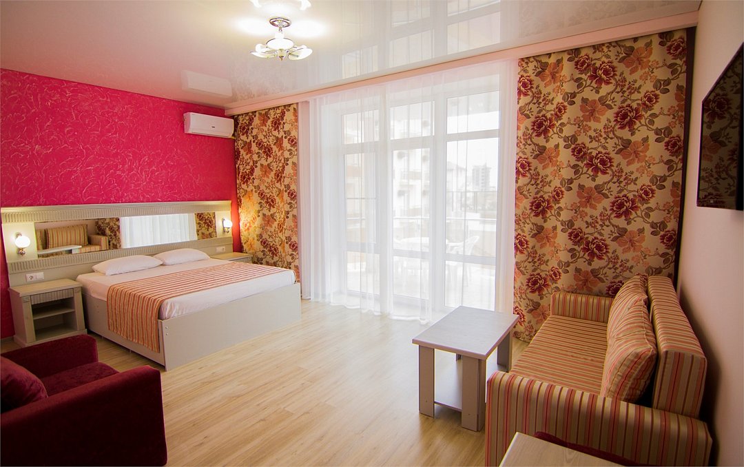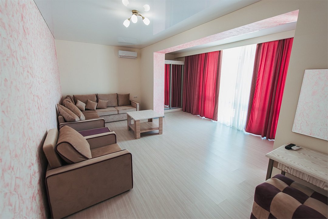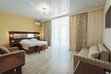 Стандарт двухкомнатный – приятный интерьер создает ощущение домашнего уюта, а две комнаты позволяют гостям расположиться с максимальным комфортом. Номера данной категории расположены во 2 корпусе, вид на бассейн. Двухместный номер предназначен для размещения двоих гостей на основных местах и двоих – на дополнительных. Дополнительное место - двуспальный диван-кровать. Ребёнок до 2 лет (включительно) размещается бесплатно без места. Детская кроватка предоставляется бесплатно при наличии. Расчетные часы: заезд после 14:00, выезд до 12:00.Услуги и удобства
