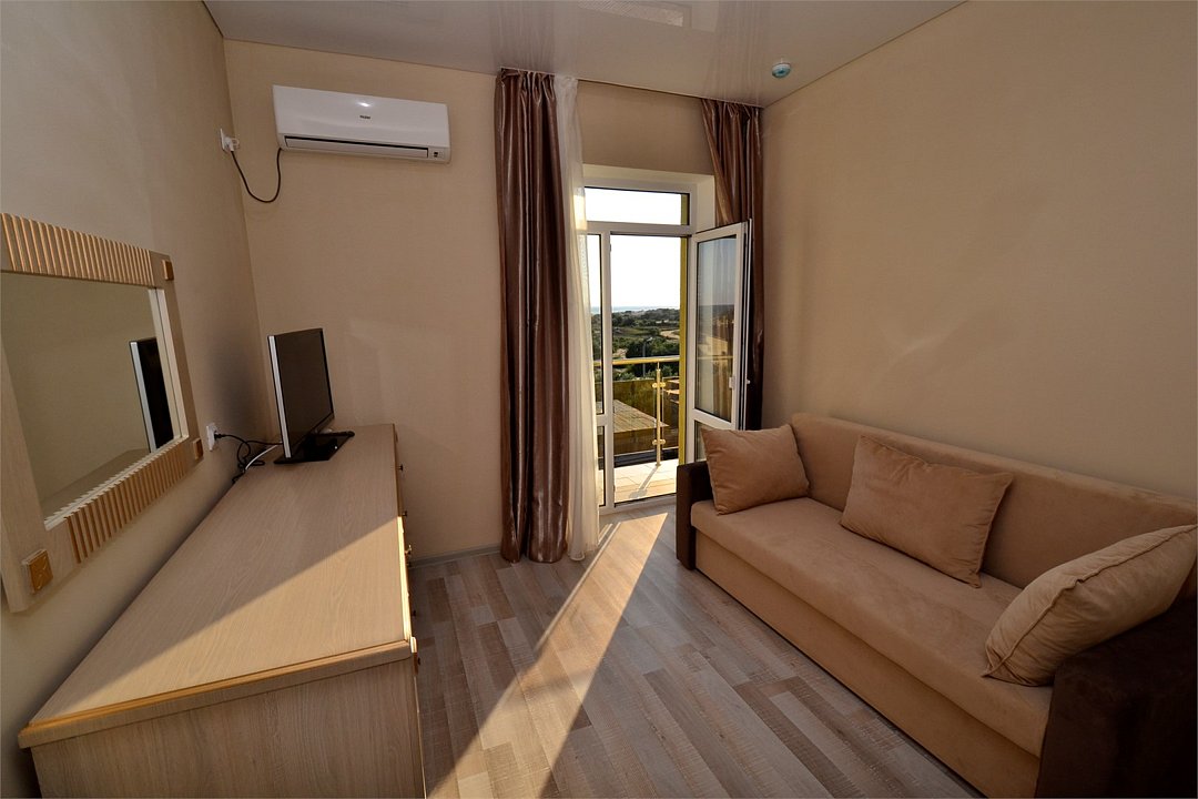 Комфорт – уютный однокомнатный номер с балконом улучшенной категории, оснащен всем необходимым для отдыха. Приятный интерьер создает ощущение домашнего уюта. Номер предназначен для размещения двоих гостей на основных местах и двоих – на дополнительных. Номера данной категории расположены в 1 и 3 корпусах. Дополнительные места: диван и кресло-кровать. Ребёнок до 2 лет (включительно) размещается бесплатно без места. Детская кроватка предоставляется бесплатно при наличии. Расчетные часы: заезд после 14:00, выезд до 12:00.Услуги и удобства